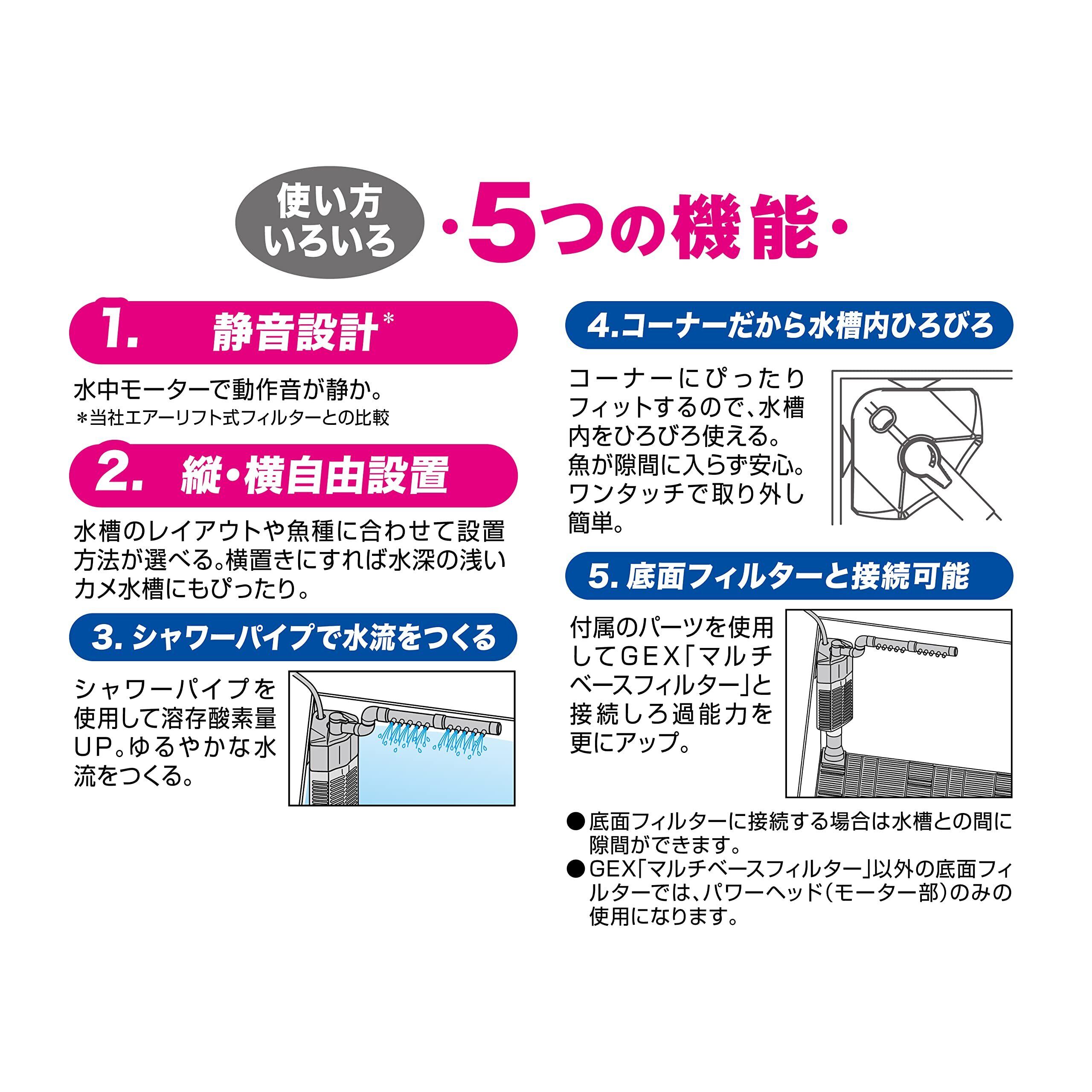 【5つの機能】1.静音設計 水中モーターで動作音が静か。※当社エアーリフト式フィルターとの比較。2.縦・横自由設置 水槽のレイアウトや魚種に合わせて設置方法が選べる。横置きにすれば水深の浅いカメ水槽にもぴったり。3.シャワーパイプで水流をつくる シャワーパイプを使用して溶存酸素量UP。ゆるやかな水流をつくる。4.コーナーだから水槽内ひろびろ コーナーにぴったりフィットするので、水槽内をひろびろ使える。魚が隙間に入らず安心。ワンタッチで取り外し簡単。5.底面フィルターと接続可能 付属のパーツを使用してGEX「マルチベースフィルター」と接続しろ過能力を更にアップ。