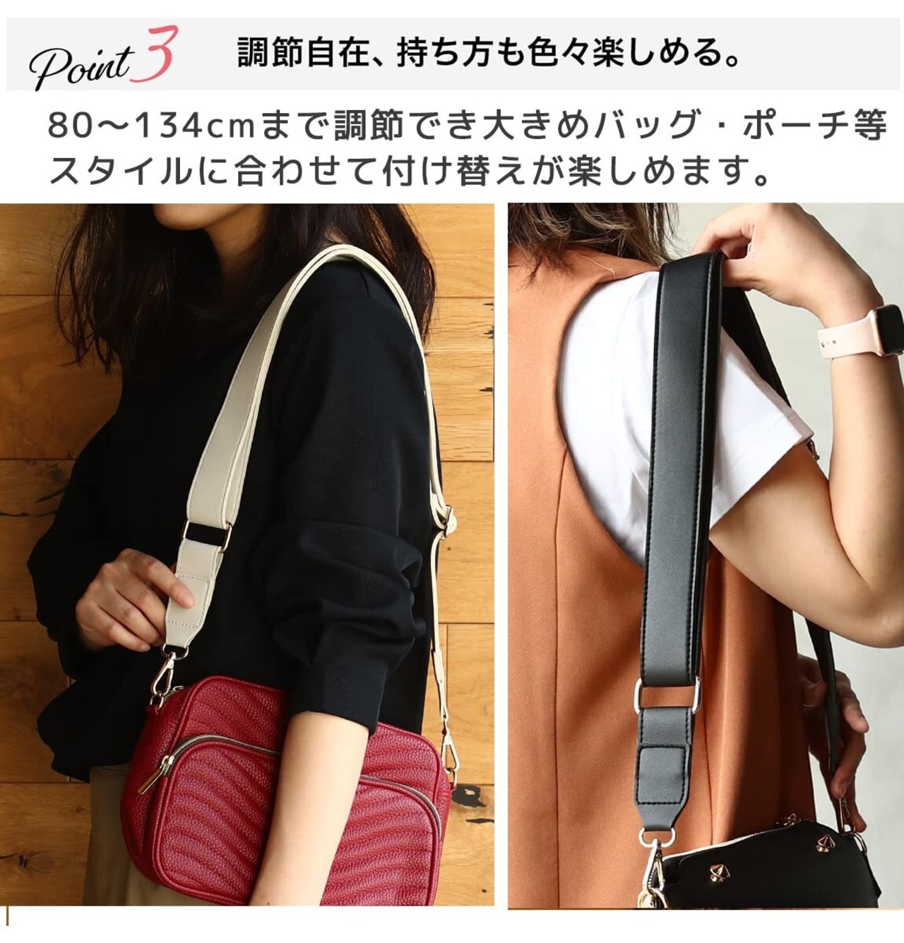 ショルダー紐長さ約80~134cm(フック含む)、ベルト幅約3.9cm、厚み約4mm、重さ約136g、合成皮革素材