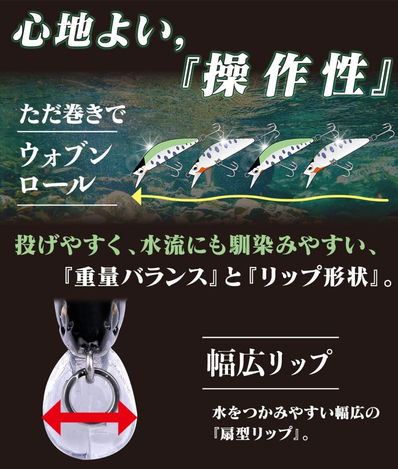 【心地よい操作性】水流に馴染みやすいウェイトバランスと水流を捉えやすいリップ形状により、投げやすく、水中での操作もしやすい、入門用のルアーとして使えます。