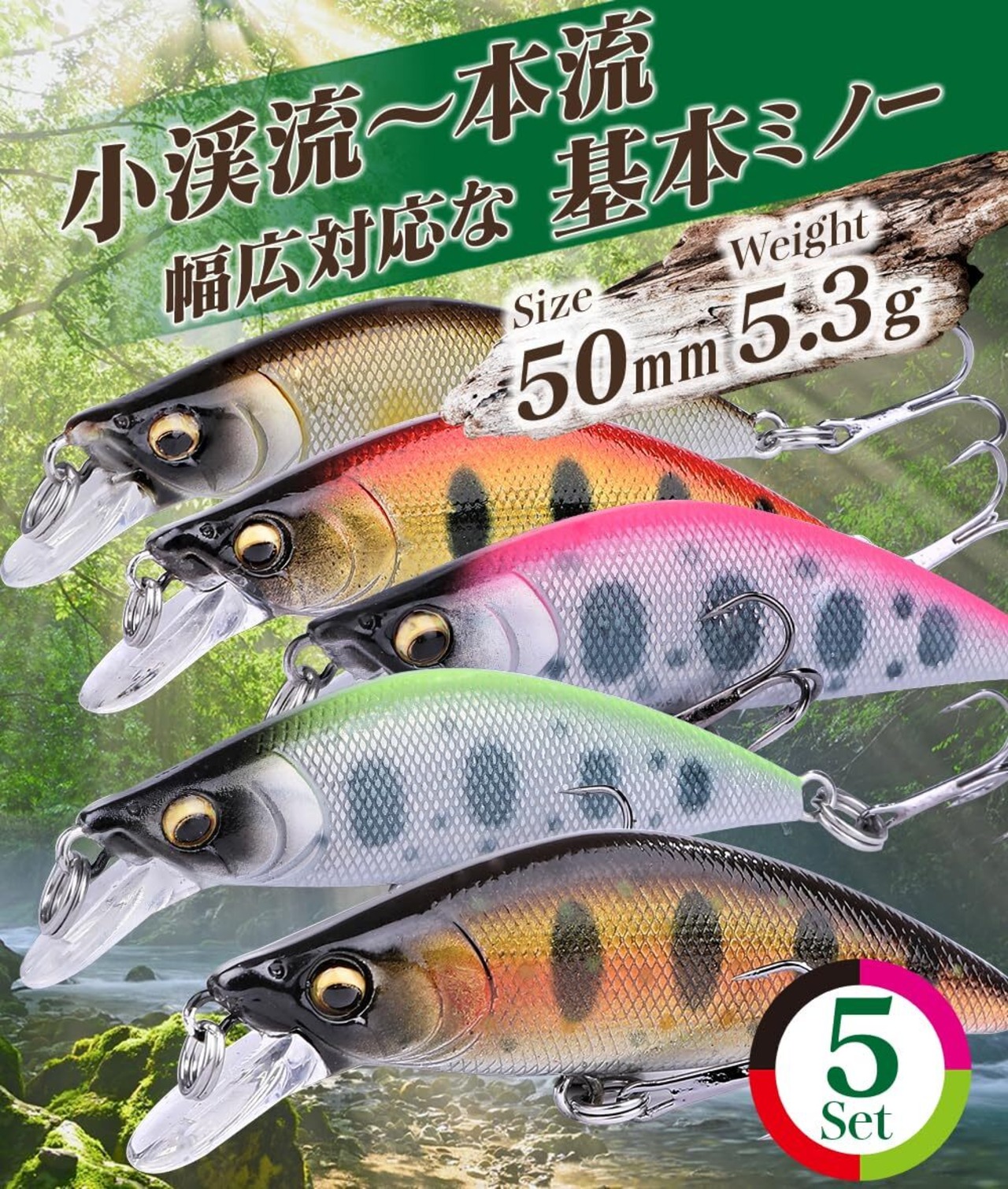 Contyu 渓流ミノー 5個 セット トラウト ヘビーシンキング ミノー ルアー 50mm 5.3g (50mm/5.3g, カラーA(5個セット))