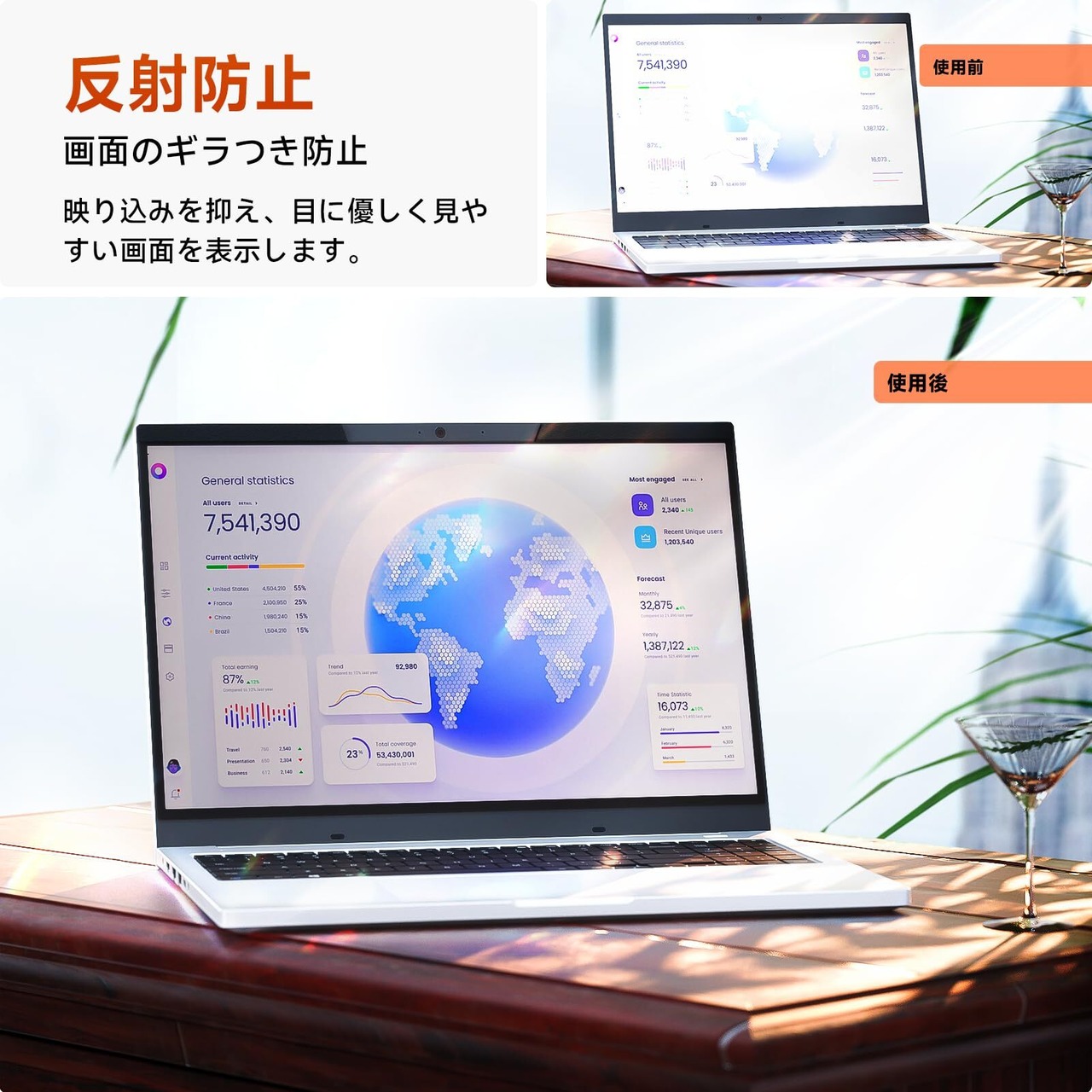 【ブルーライトカット・反射低減】長時間にパソコンのスクリーンから発せられる有害光線を浴びると目の疲れ、ドライアイ、睡眠が乱れるなど体へ影響が益々懸念されています。本プライバシーフィルムは青色光と紫外線カット機能を備えて、ブルーライトを約50%低減し、使用者のプライバシーを守るだけではなく、目も守りますので、体や視力を考えるなら、ブルライトカット対応のプライバシーフィルムがおススメします。