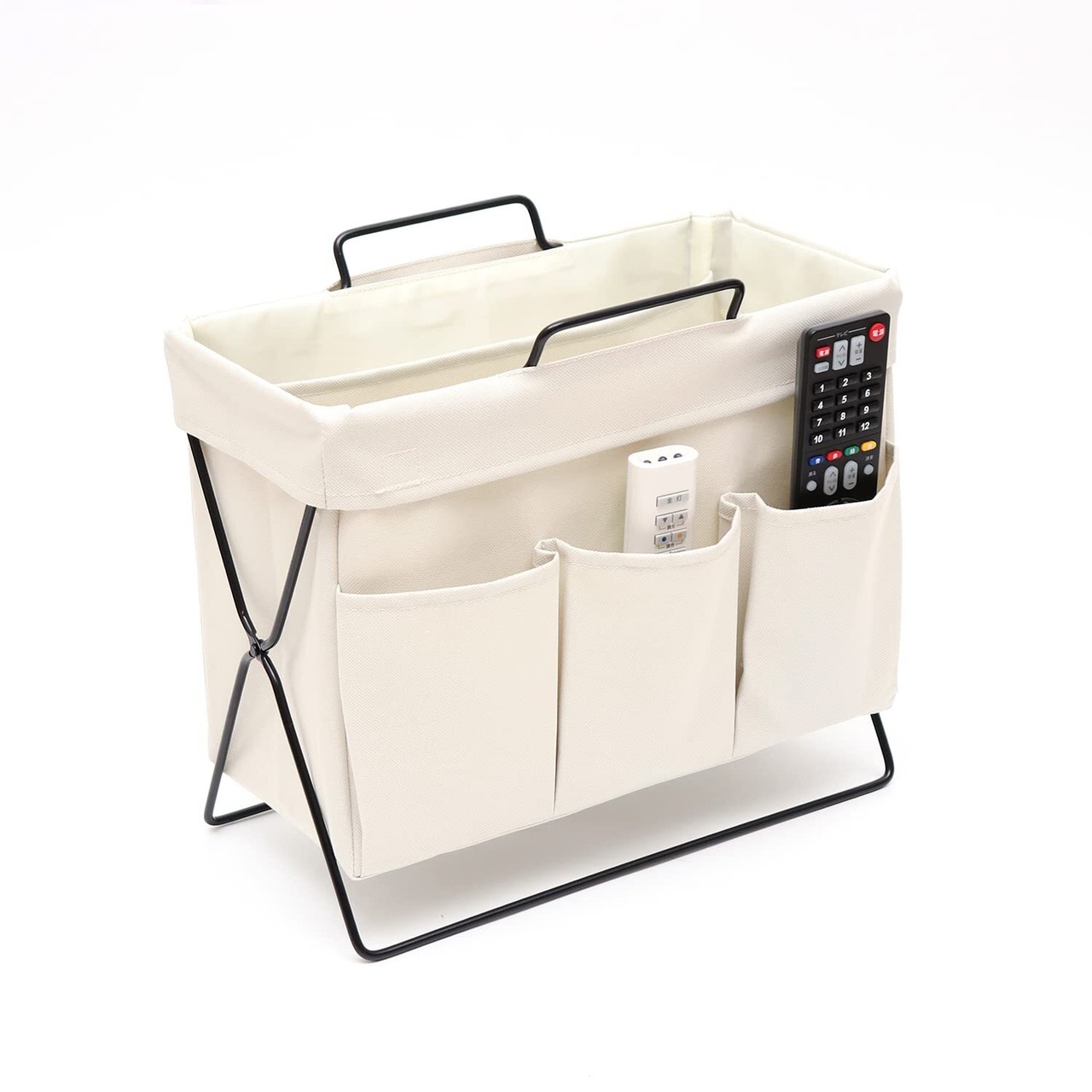 ストレリアミラド リビングラック マガジンラック デスク 机 テーブル ソファー 横 新聞 リビング オフィス カバン バッグ ブランケット 収納 ポケット3個 取っ手つき リモコン タブレット 持ち運び 折り畳み おしゃれ(アイボリー)