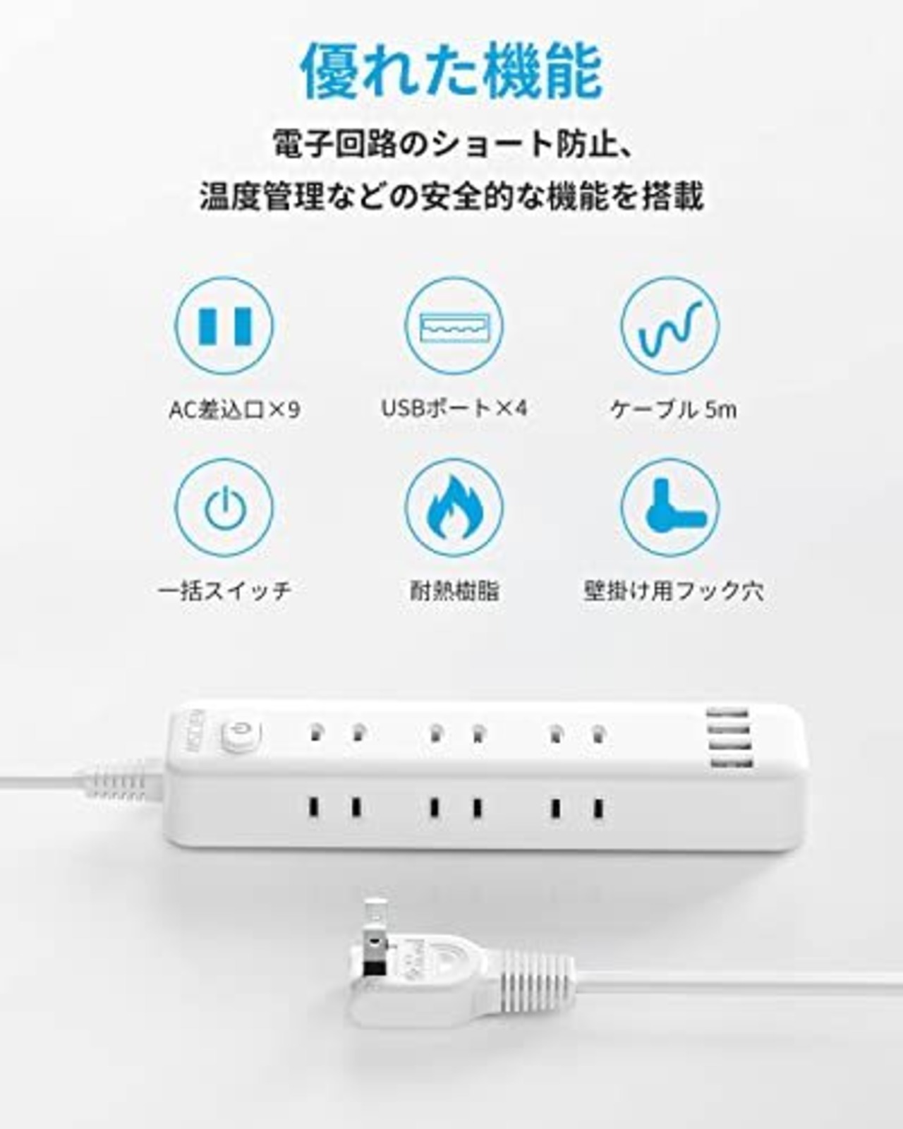 「1台13役・延長コード」9つAC差込口と4つUSB-Aポートがある電源タップです。延長コードがあって、便利です。