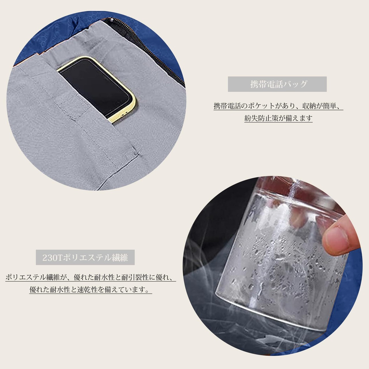 【優れる素材】表地:さらさら高密度生地(ポリエステル100%)+撥水コーディング、防水性・撥水性に優れているのが特徴です。野外で多少の雨や霧に見舞われても、体を濡らすことなく過ごせます。内生地:肌触りが良いソフト生地(ポリエステル100%)、柔らかくて快適な素材で、いつでも寝袋に入ると暖かい感じがします。内生地:肌触りが良いソフト生地(ポリエステル100%)、上質な繊維素材で質感がよく、ふとんのように柔らかくて肌触りがよい、寝袋に入った瞬間でも暖かく感じられます。裏地:詰め物::防寒性能に優れたシルクコットンを採用しています。肌触りと寝心地がよいです。
