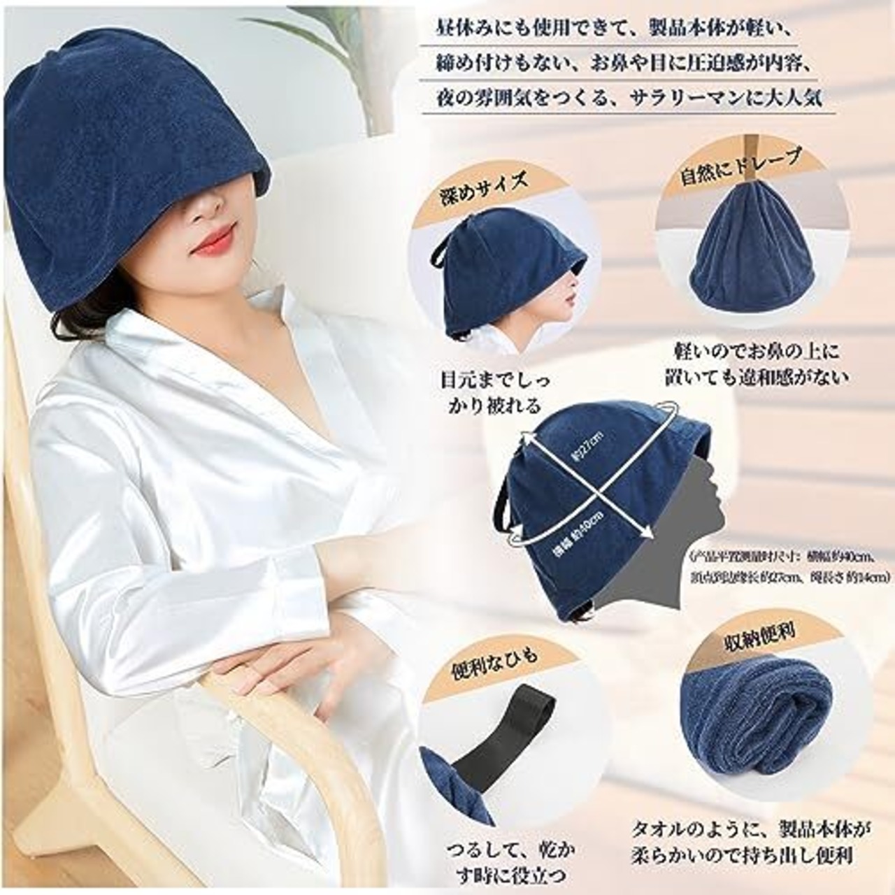 【髪のダメージやのぼせ防止】サウナの高温&乾燥から美髪を保護し潤いを保ちます。のぼせや熱さによる耳や頭部へのダメージを防ぎ、長時間のサウナご利用や目線を遮って集中するのにもおすすめです。