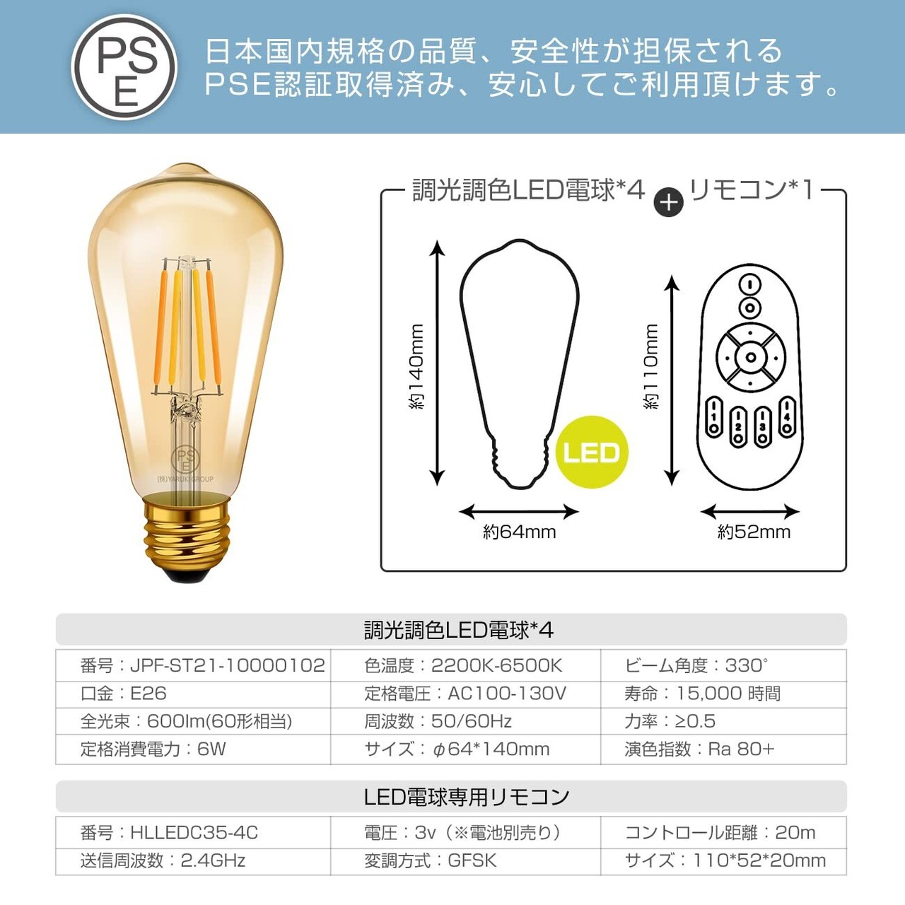 【商品仕様】素材:ガラス。Ra>80。電球サイズ:直径64mmx高さ140mm。全光束:600LM(調光可能)。色温度:2200-6500K(調色可能)。口金:E26。調光:リモコン付き(電池別売)【※注】: リモコンは使用する前にペアリングする必要があります。 ペアリングプロセスが正常に続行できない場合は、アフターカスタマーサービスにお問い合わせください。