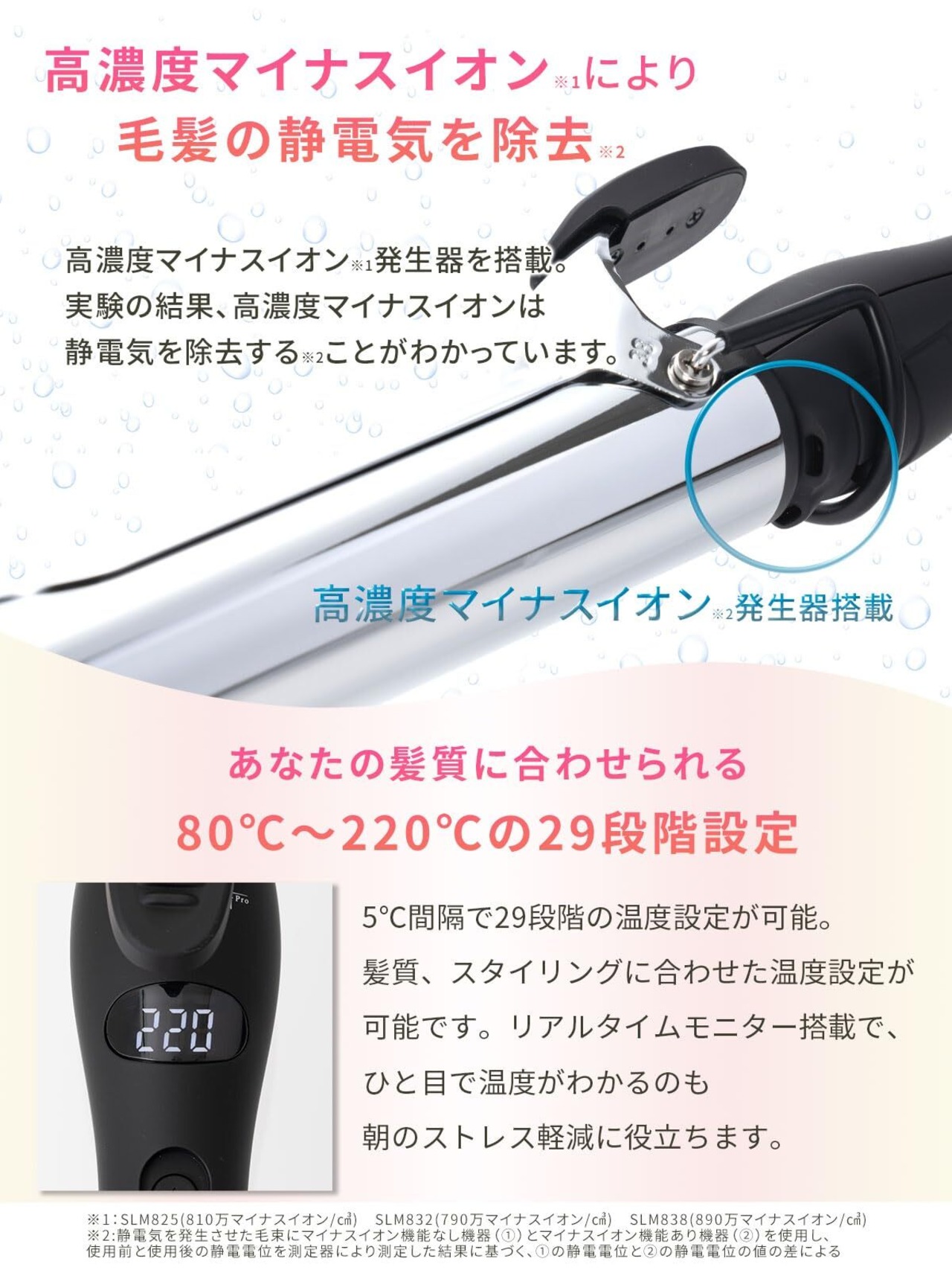 【高濃度ダブルマイナスイオン】発生器搭載。旧モデルにはなかった、 高濃度マイナスイオン発生器をプレート近くに配置。 高濃度マイナスイオンの効果をより実感いただけるよう 吐出口を2つにしました。 また、静電気を約95%抑制※3。 パサつきや広がりを抑え、毛先までプルンと まとまりのあるスタイリングを可能にしました。【 ミラーチタニウムプレートを採用 】高級機並みのクオリティの ヘアアイロン を格安でご提供できるのが SALONMOON ( サロンムーン )の強みです。 滑らかな チタン 素材の プレート を採用。ツヤとまとまりのある美しい カール ヘア を簡単に作ることができる、こだわりの カールアイロン です。