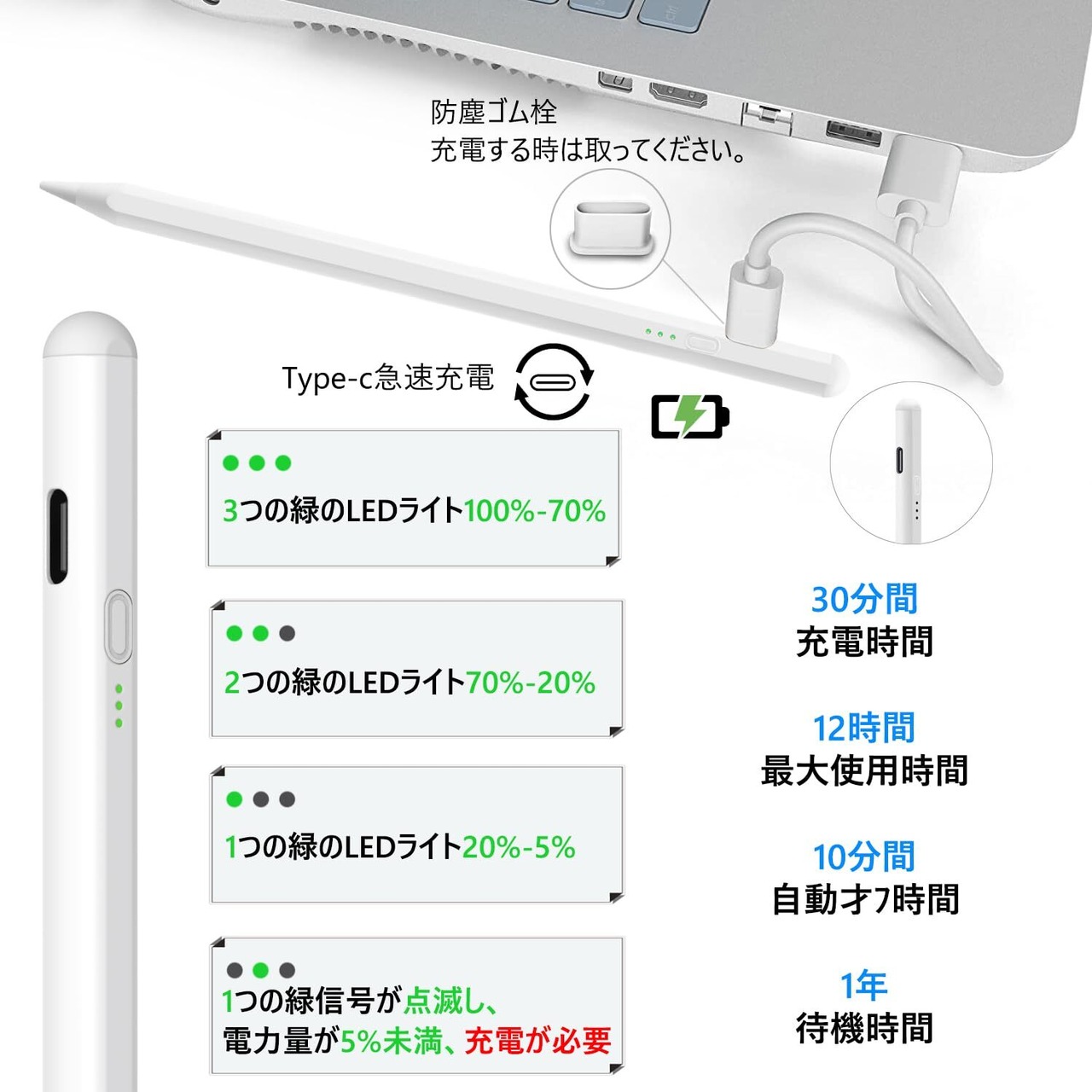 【Type C 急速充電、長時間使用、分かりやすい電池残量】30分間フル充電で11時間継続使用可能となります。待機時間 1年。静止の状態で 、10分間 放置すると自動オフし、電源の切り忘れを 防止でき、バッテリーの節約に役立ちます。最新このiPad専用ペンシルは、より多くのお客様のご要望にお応えして、バッテリー残量を確認しやすいLEDインジケーターを搭載しています。電池残量が、「5%~20%」・「20%~70%」・「70%~100%」の3段階で確認できる為、タッチペン使用中に急に電源が切れてしまうような心配がありません。緑色のランプが点滅しているときは、充電が必要なことを意味します。バッテリーも非常に耐久性があります、長時間ご利用いただけます。
