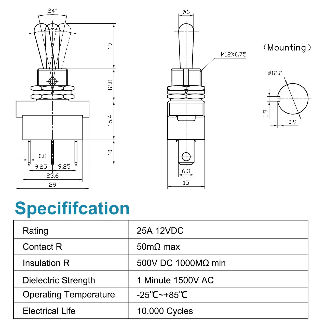 Heschen 金属製トグル スイッチ フリック フリップ、KN3D-103、12V 25A、SPDT、ON/OFF/ON、3 ポジション、3 ピン、車のダッシュ ライト用