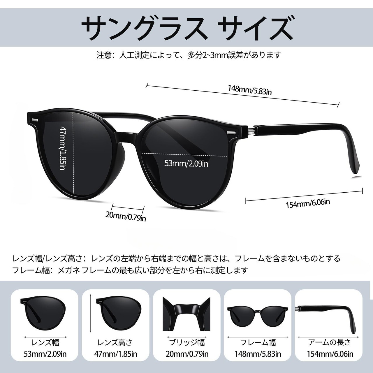 商品仕様: レンズ幅:53 mm(レンズの左端から右端までの幅は、フレームを含まないものとする ) レンズ高さ:47 mm(レンズの上端から下端までの高さは、フレームを含まないものとする) 全体のよこ幅:148mm(メガネ フレームの最も広い部分を左から右に测定します)ブリッジ幅:20mm;アームの長さ:154 mm;重量:約20g;ご注意:人工測定によって、多分2~3mm誤差があります