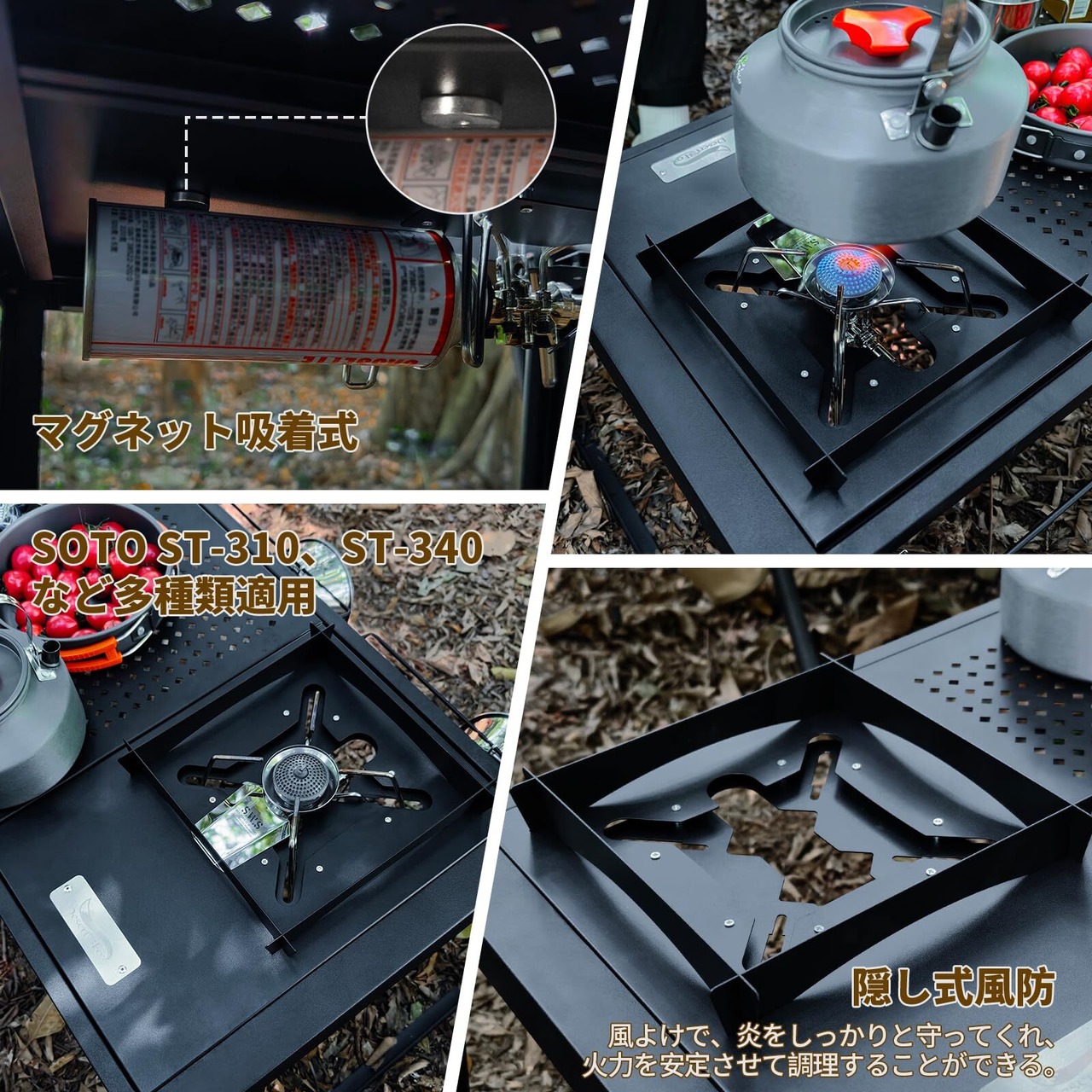 【隠し式風防】風よけで、炎をしっかりと守ってくれ、火力を安定させて調理することができ、また、別途風防を準備する必要はなく、使用しない時は、天板の裏面に取り付けて、隠し収納することができます。