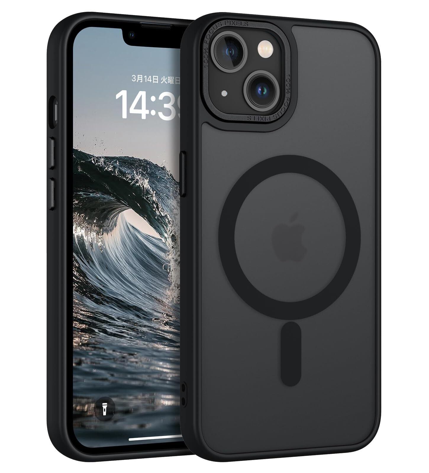 GUAGUA iPhone14 ケース MagSafe対応 半透明 iPhone13 ケース TPU いPhone13 14 ケースマグネットMagsafe内蔵 ケース マット感 スマホカバー 耐衝撃 指紋防止 ワイヤレス充電 ストラップホール付き iPhone 13/14 兼用 6.1インチ 保護ケース (ブラック 黒い)
