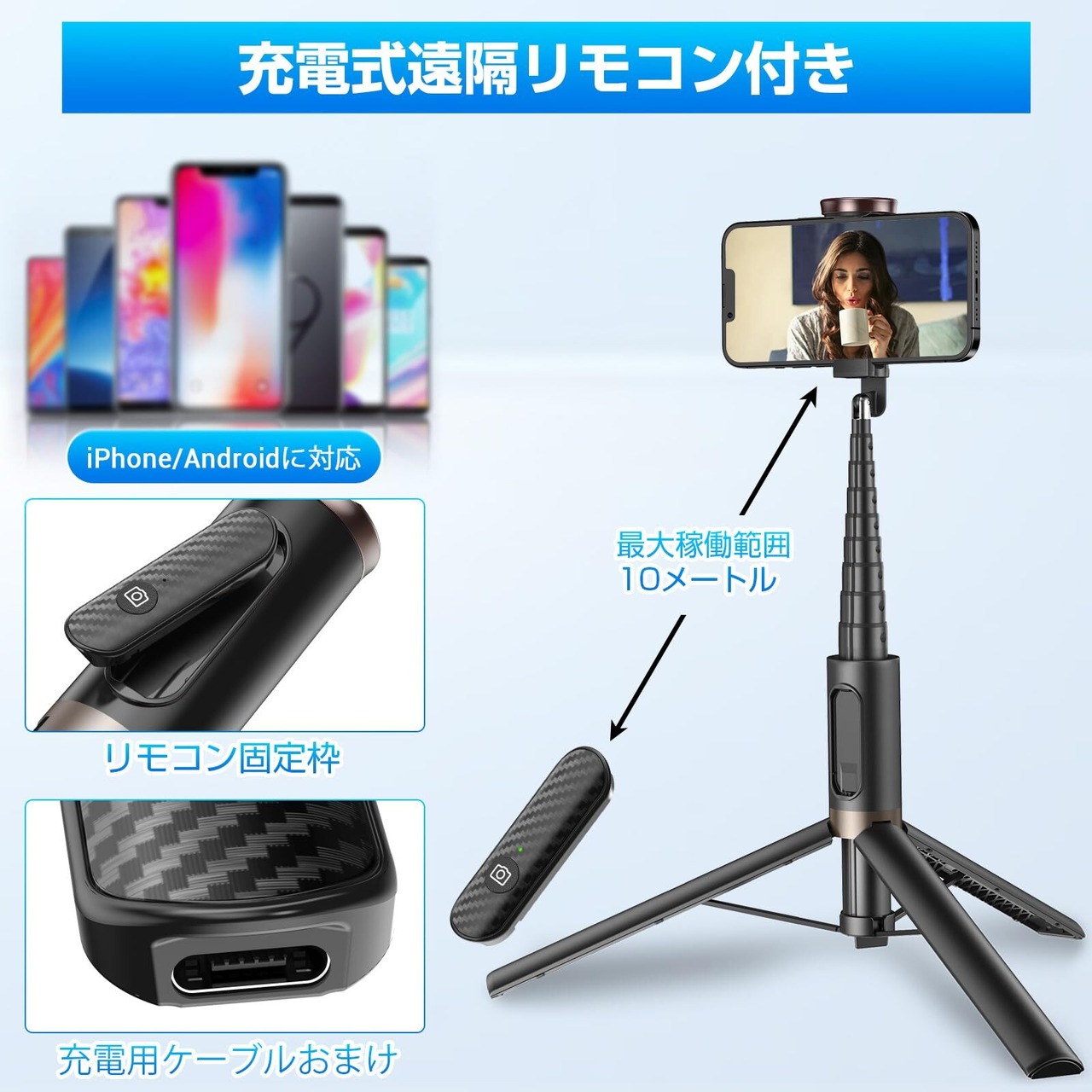 リモコン付き、撮影が楽々:自撮り棒には、リモコンが付属しており、撮影が驚くほど簡単です。自撮りや大人数の集合写真の際には、リモコンを使ってワンシャッターを操作できるため、スマホを手に持つ必要がなく、自然なポーズでの撮影が可能です。充電ケーブルおまけで、長時間の使用にも対応できる設計となっており、旅行中の電量切れの心配もありません。紛失防止のため、使用後はリモコンを三脚の溝に収納してください。