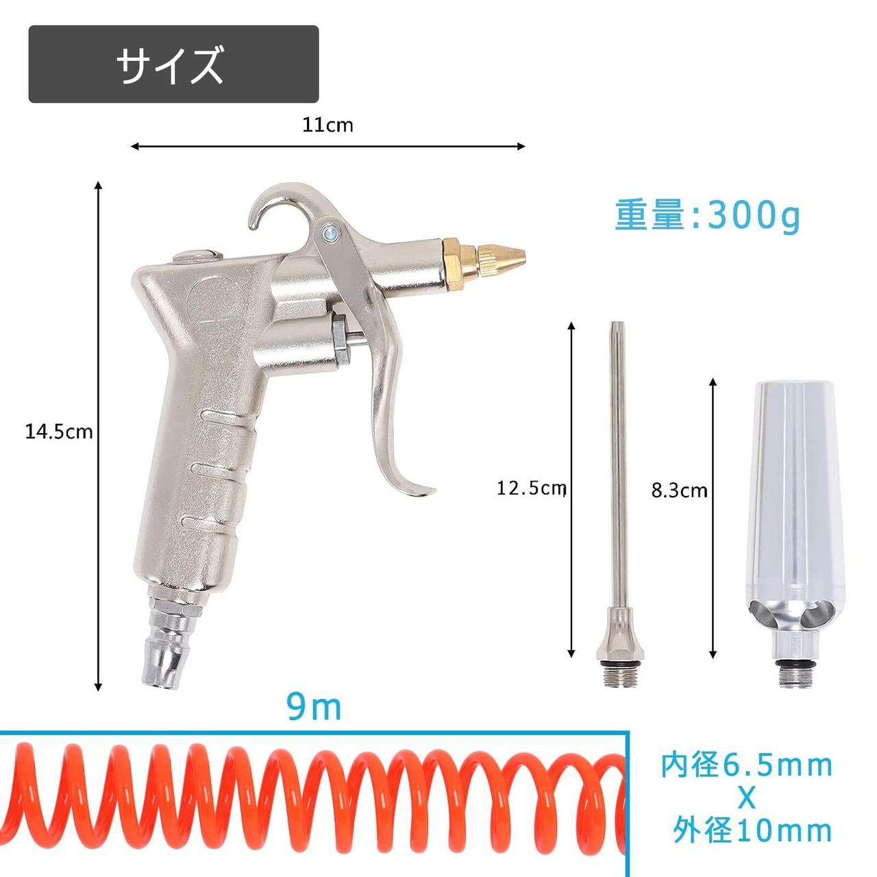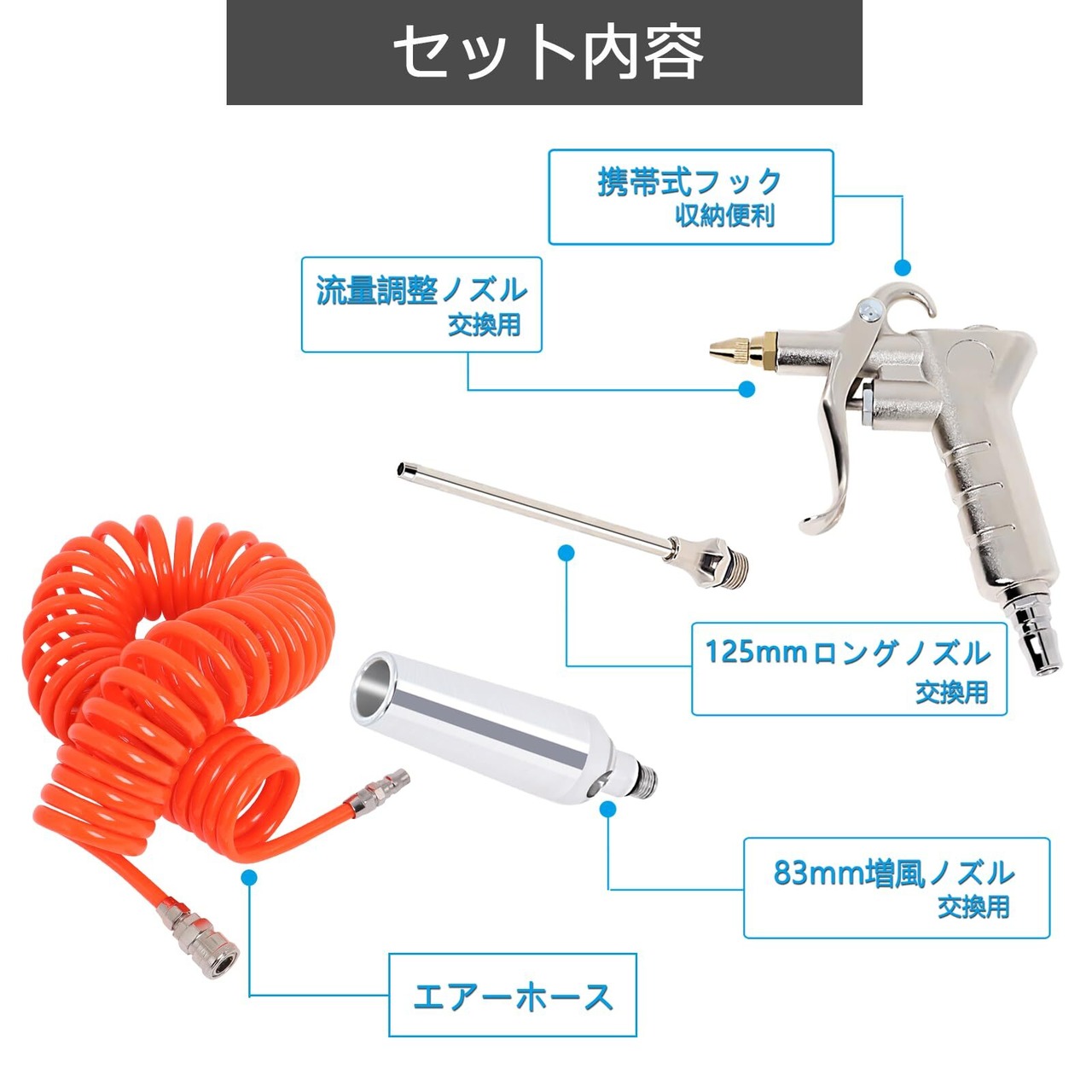 【セット内容】エアダスター本体、流量調整ノズル、130mmロングノズル、増風ノズル、スプリングエアーホース(ワンタッチソケット付き)