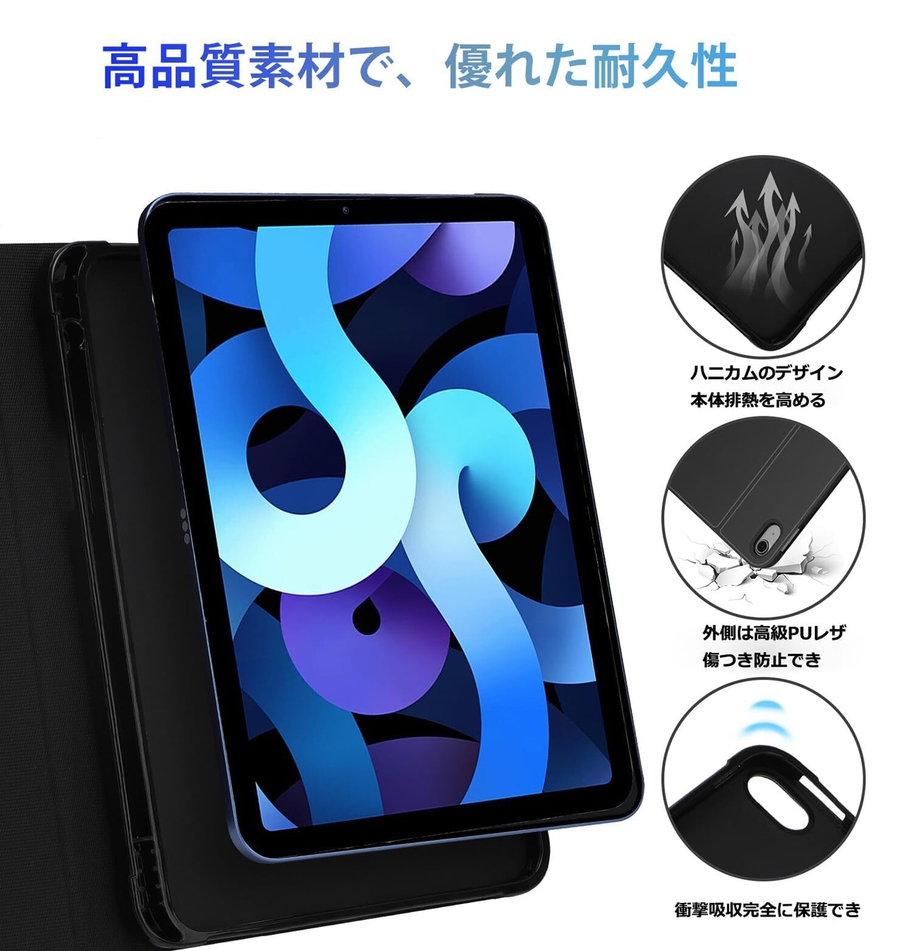 [優れた耐久性&弾力性]:裏側には柔軟ハニカム3D構造を採用しており、放熱性に優れて、電池寿命を延長されます。外側は高級素材で、ipad に合わせた作り、全面保護、耐摩耗性 傷つき防止します。穴は特別に加工されて、iPadの電源ボタンと音量ボタンもしっかり保護します。