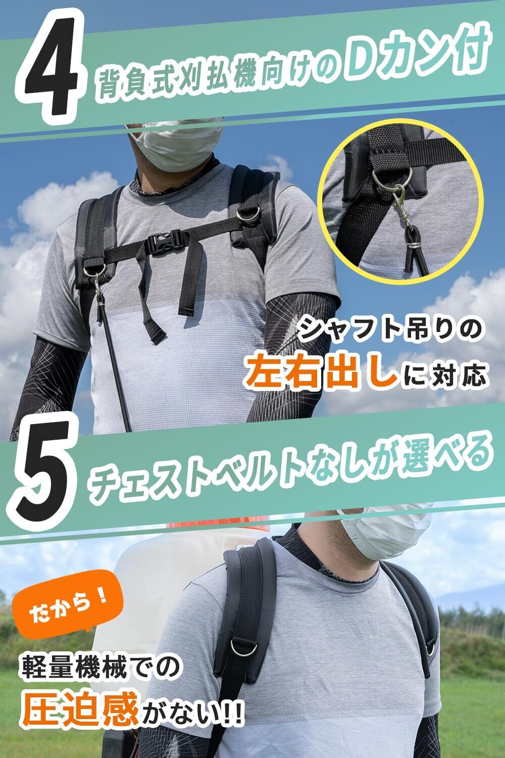 【適応背負い機械】 本製品は、背負い式エンジン草刈機、動力噴霧器、背負式噴霧器、背負動力噴霧機、除草剤散布機、背負い式肥料散布機、背負い式携帯型集塵機、背負い式草刈り機、背負い式電源などに対応しています。 ※背負わないタイプの肩掛け式エンジン刈払機には使用できません。