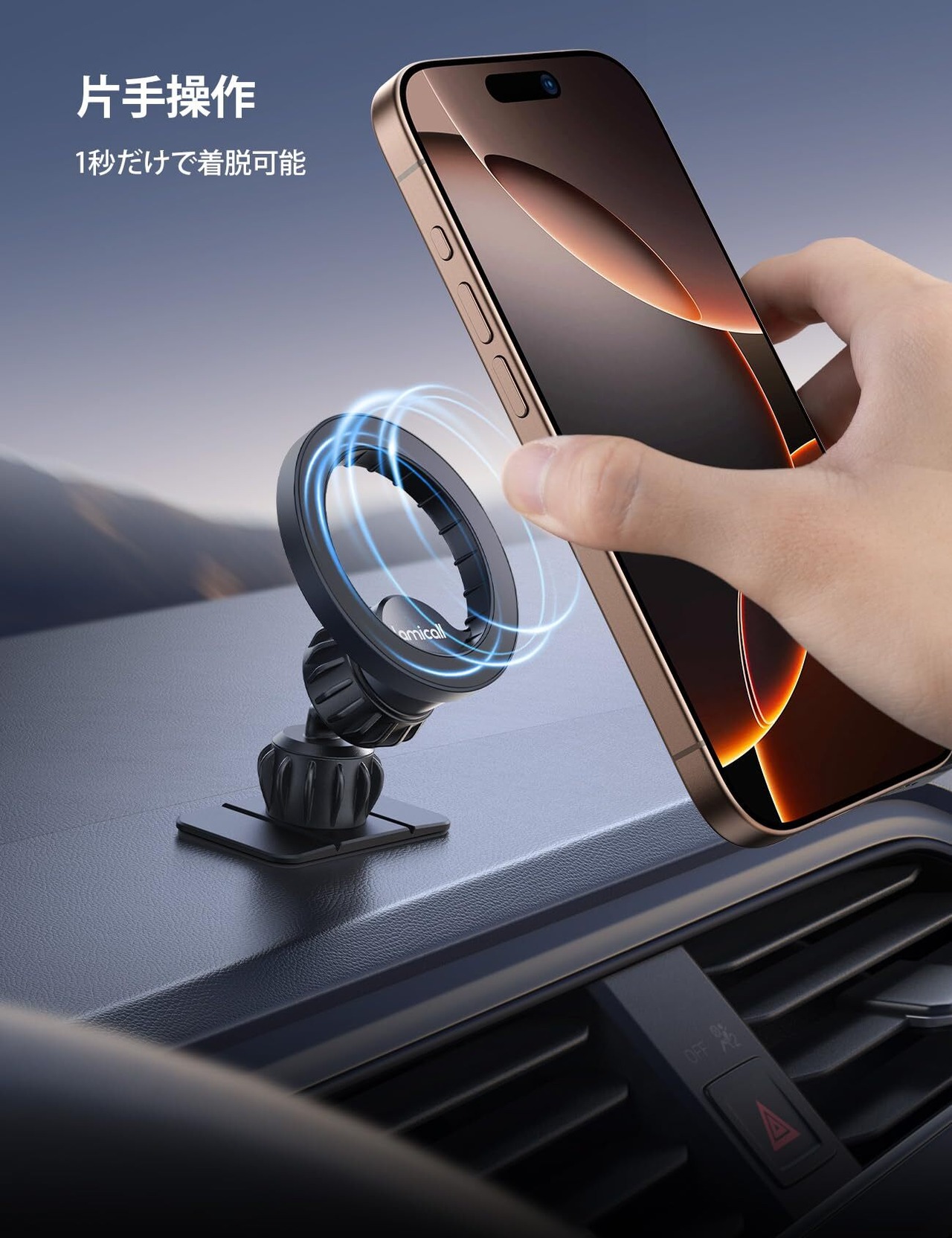 【コンパクト】マグセーフ車載スマホスタンドは全体的にコンパクトだから、ダッシュボードや中央に貼っても邪魔にならないし、視界を妨げることもありません。小型車でも窮屈さを感じることはありません。