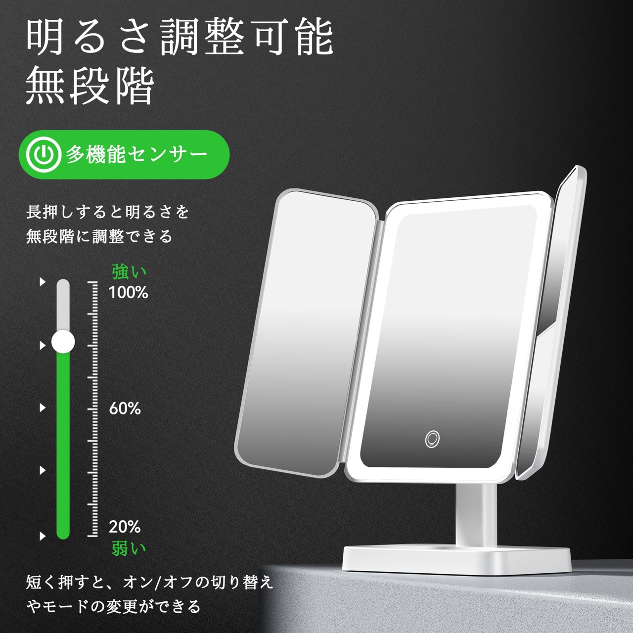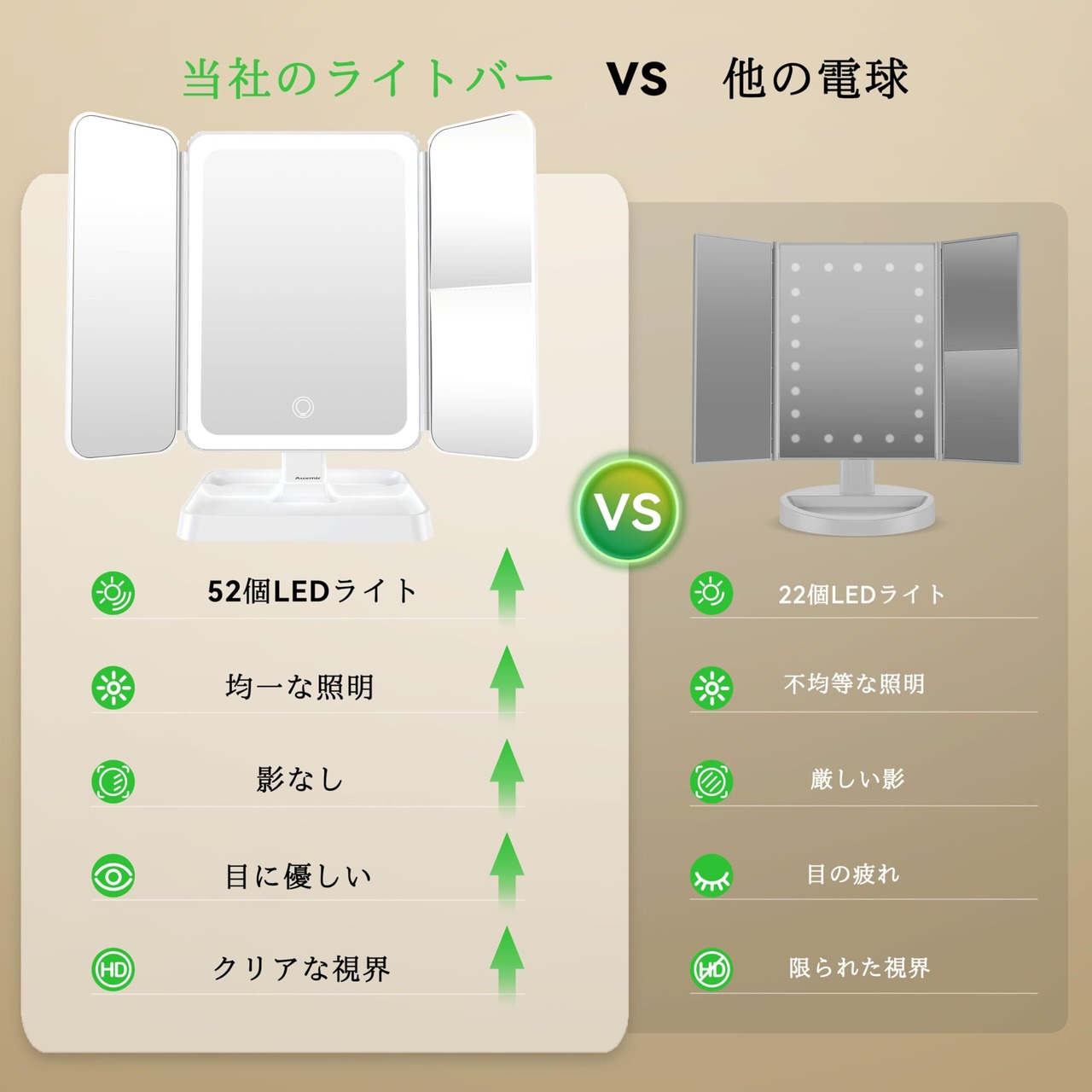 Auxmir 女優ミラー 三面鏡 卓上鏡 52個LED ライト付き 拡大鏡 2/3倍 3光色 折りたたみ 化粧 180°回転 卓上ミラー 鏡 メイク USB充電 タッチ式 明るさ調節可能 角度調整 収納スペース ホワイト