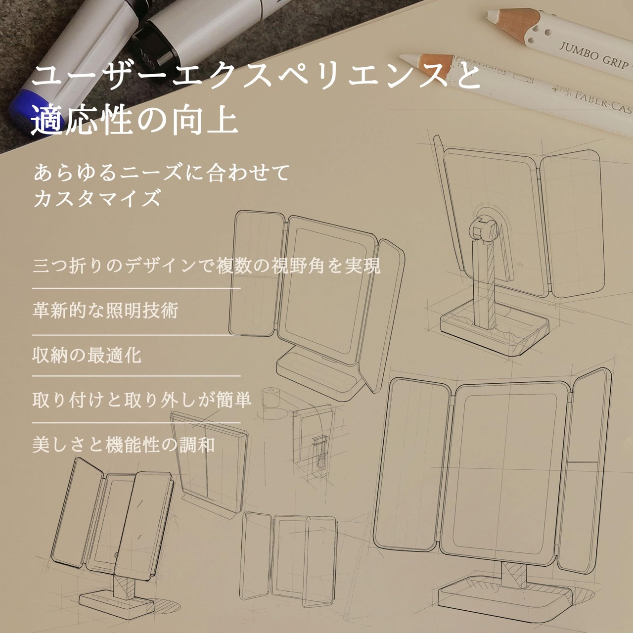 【多機能・プレゼント】ミラーの表面はレザーのデザインで、おしゃれでかわいい外観としました。また、鏡は明るさの無段階調光、3つの光色(昼光色、昼白色、電球色)と3種類の拡大率(1X/2X/3X)など、卓上鏡を楽しくご利用頂ける機能を搭載しました。ユニークな三つおりとコンパクトなデザインにより、どの祝日にも最適なギフトです。自分用としてだけでなく、彼女、母親、友人、同僚へのギフトとしてもおすすめです。