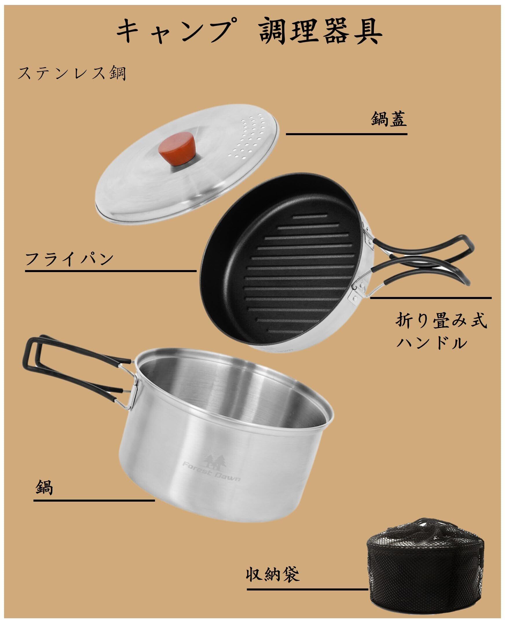 Forest Dawn クッカーセット キャンプ 調理器具 キャンプ用品 一人旅用 アウトドア 超軽量 鍋 こびりつかないフライパン 折りたたみ可能 多機能炊事用具 ih対応 清潔簡単に調理 キャンプ/登山に便利/防災にぴったり 収納袋付 1-2人用 初心者にも経験者にもぴったり ステンレス鋼 食器セット
