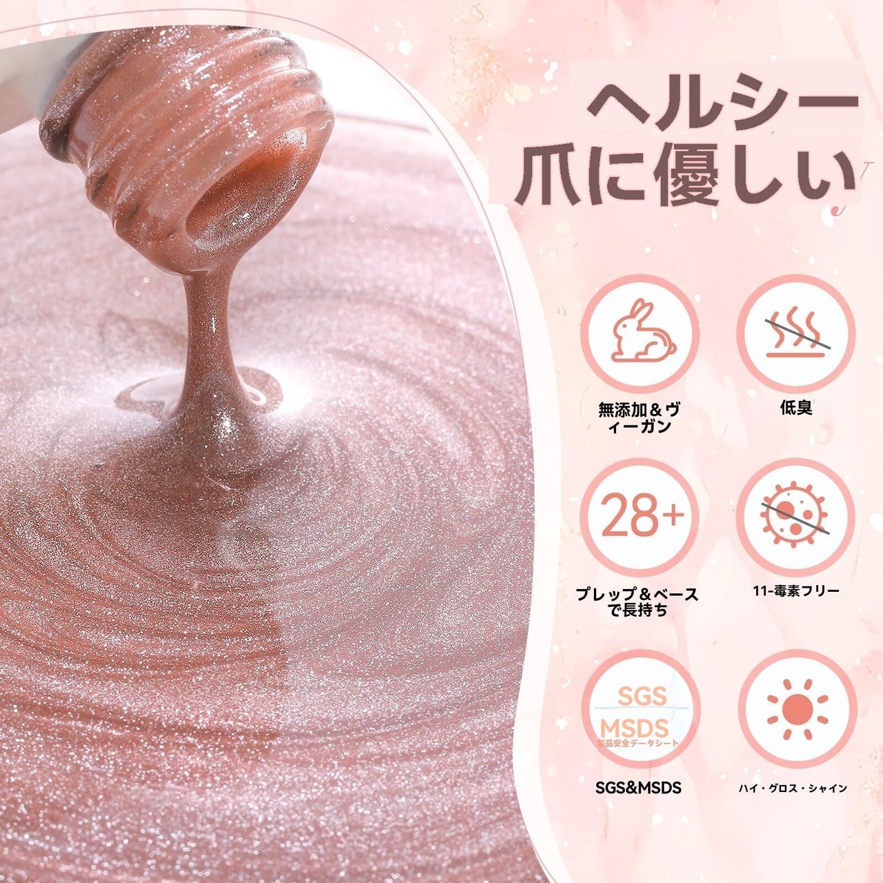 キレイな発色で、気分に合わせて、お好みに組み合わせます。正しく使用すれば、3週間以上耐久性があり。硬すぎず流れにくい絶妙なテクスチャー、プロのネイリストさんにはもちろん、初心者さんにも使いやすいテクスチャーです。