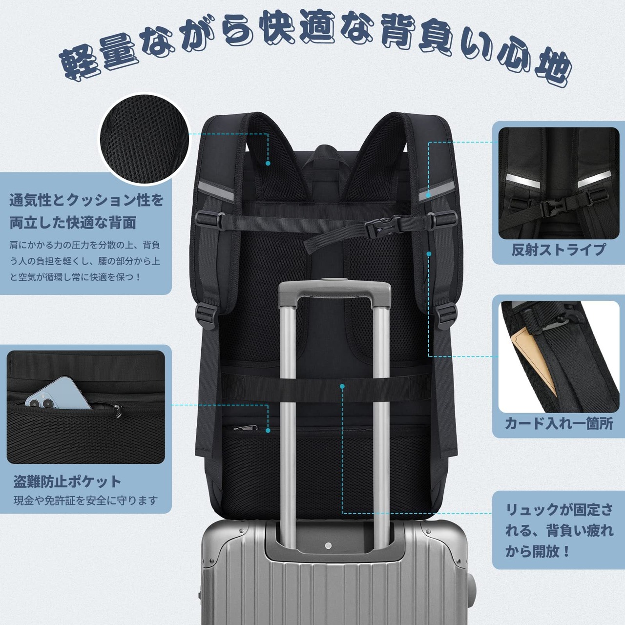 【大容量リュック】サイズ:50cm ×33cm ×18cm、機内持ち込み可能。15.6インチのノートパソコン、タブレット、A4サイズの書類、2~3日分の衣服などが手軽に収納可能。出張や旅行に欠かせないキャリーオン機能も搭載しています。