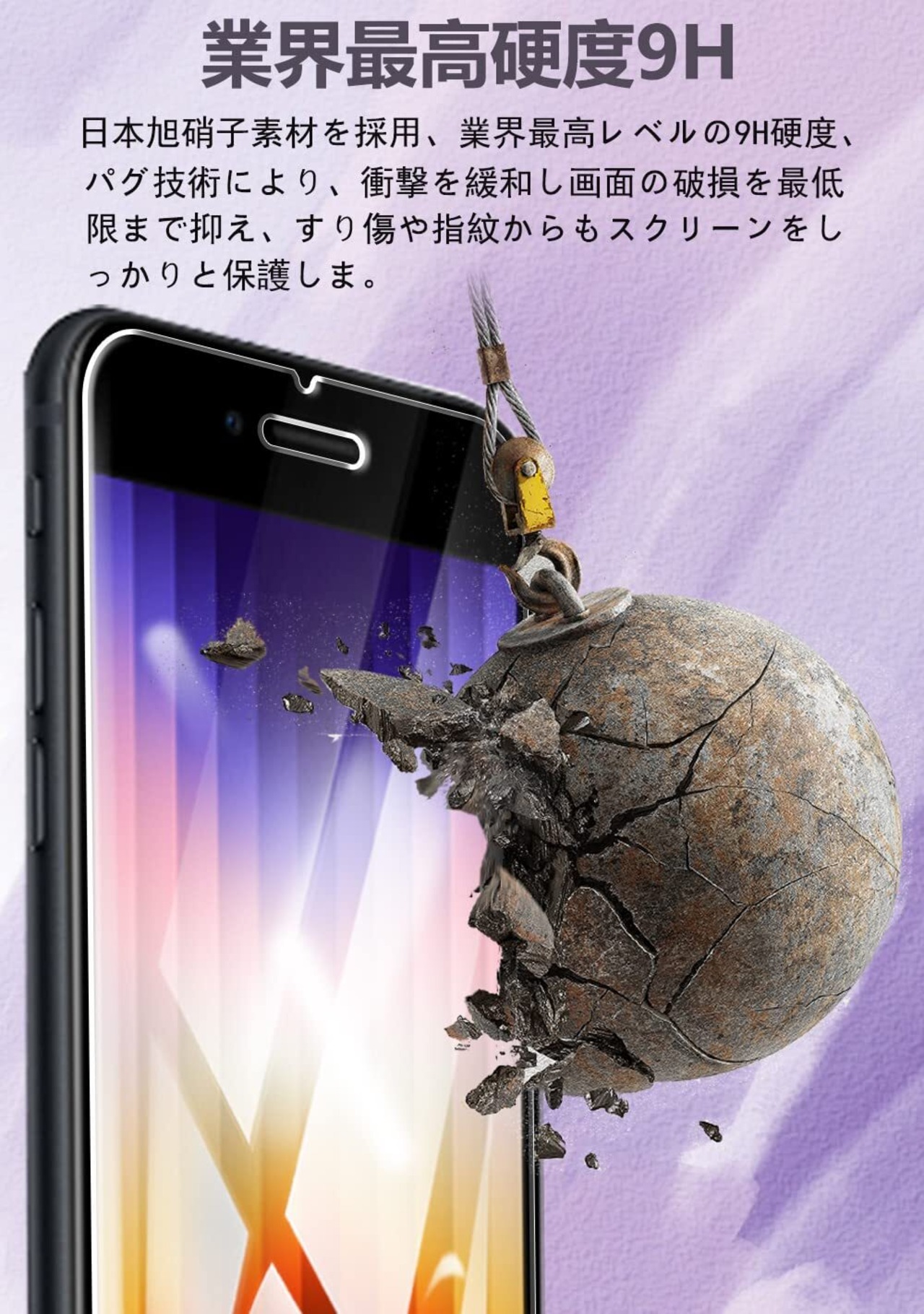 【究極の一体感・滑らかな触感】画質を徹底して追求するため、純度100%の最高級の日本製ガラスを選択し、100%透過率を実現しました。全透明ガラスフィルムこそ迫力あふれる大画面を引き出し,付いていることを忘れるくらいほどの透明感を楽しめましょう。IPhone se3 / se2 / iPhone8 / iPhone7保護フィルム表層高密度素材から本体との密着で、より速く、より滑らかなタッチ感を実現。最先端真空蒸着指紋防止技術により、画面を触っても指紋の跡が全然残りません。クリアガラスにありがちな指紋が気になるという心配がなく、清潔でクリアな状態を維持できる。いつでも画面がツルツルの状態でなめらかな画面操作。動画視聴やゲーム体験にふさわしい、理想の保護フィルムです。
