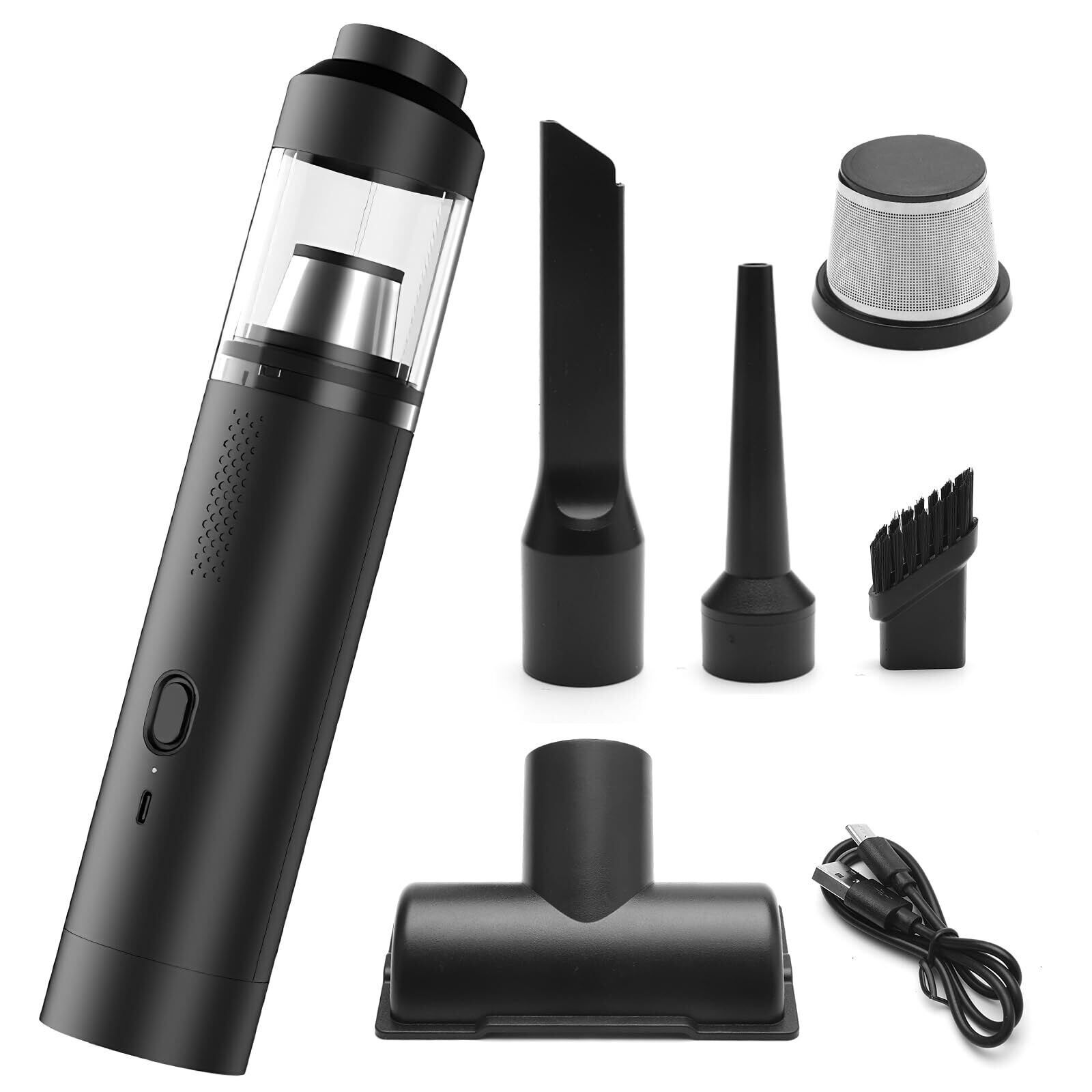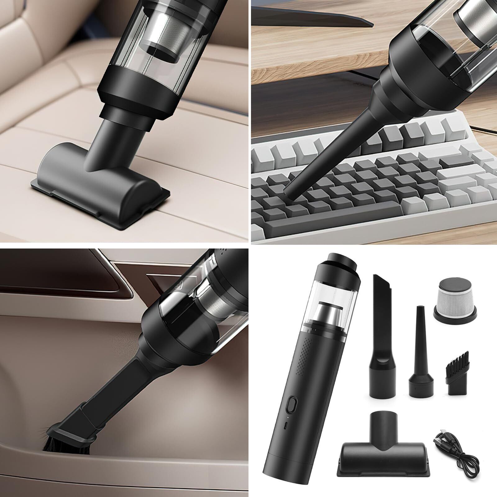 【商品セット詳細】サイズ:約25cm×5.5cmです。このハンディクリーナーは車内/自宅兼用で、3種の交換用ノズルを備えて異なる用途に使います。パッケージ内容:ハンディ掃除機x1;ノズルx4;USB充電ケーブルx1;金属製フィルターx1;収納袋 ×1