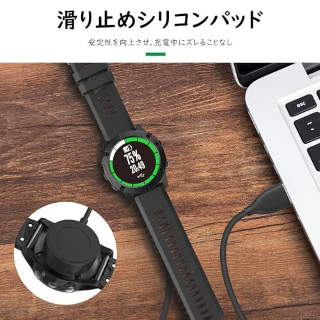 「取り扱い簡単」電源に接続し、ウォッチを充電位置に合わせてセットするだけで安定かつ安全に充電できます。約2時間半でフル充電できます。スマホなど用の急速充電アダプターの使用はご遠慮ください。