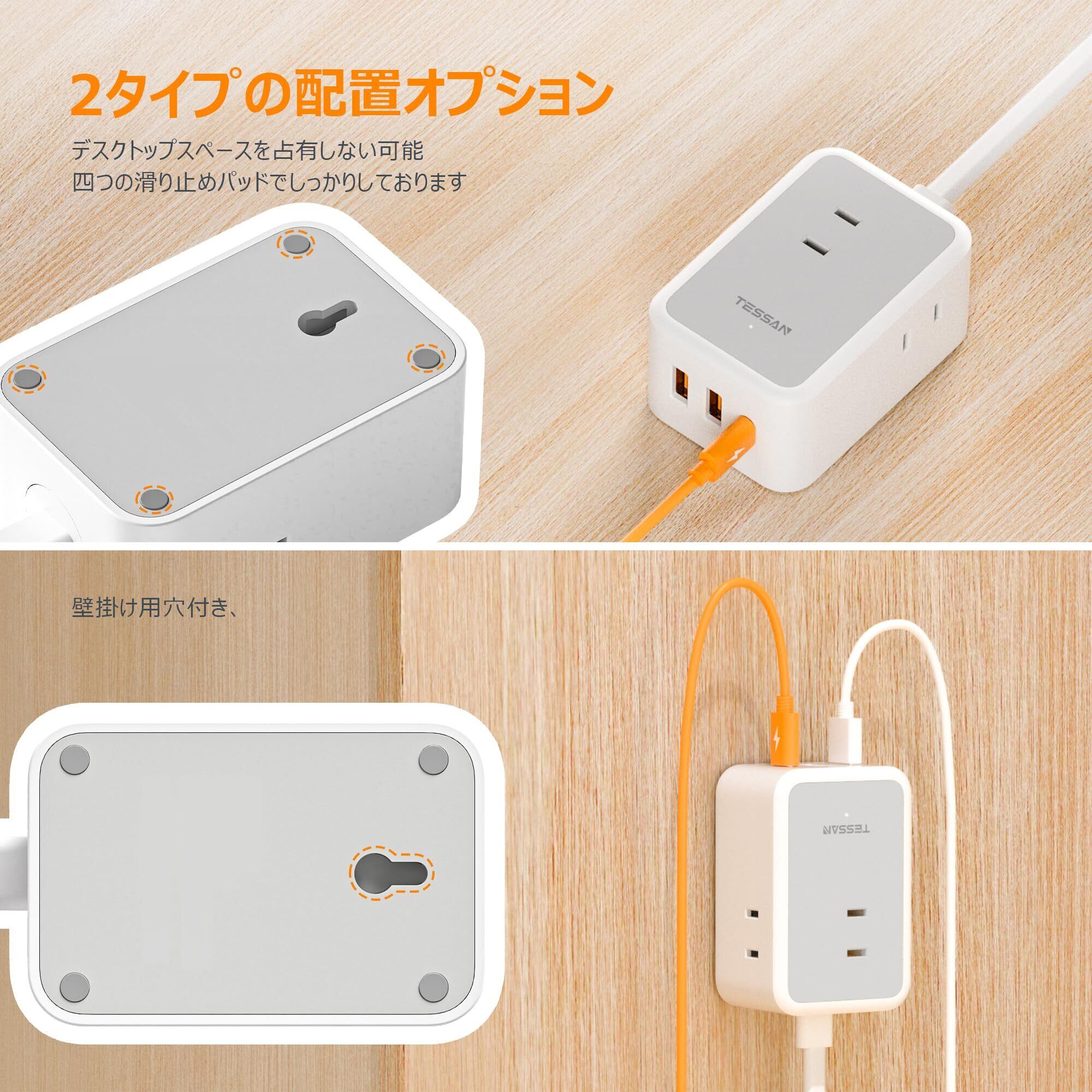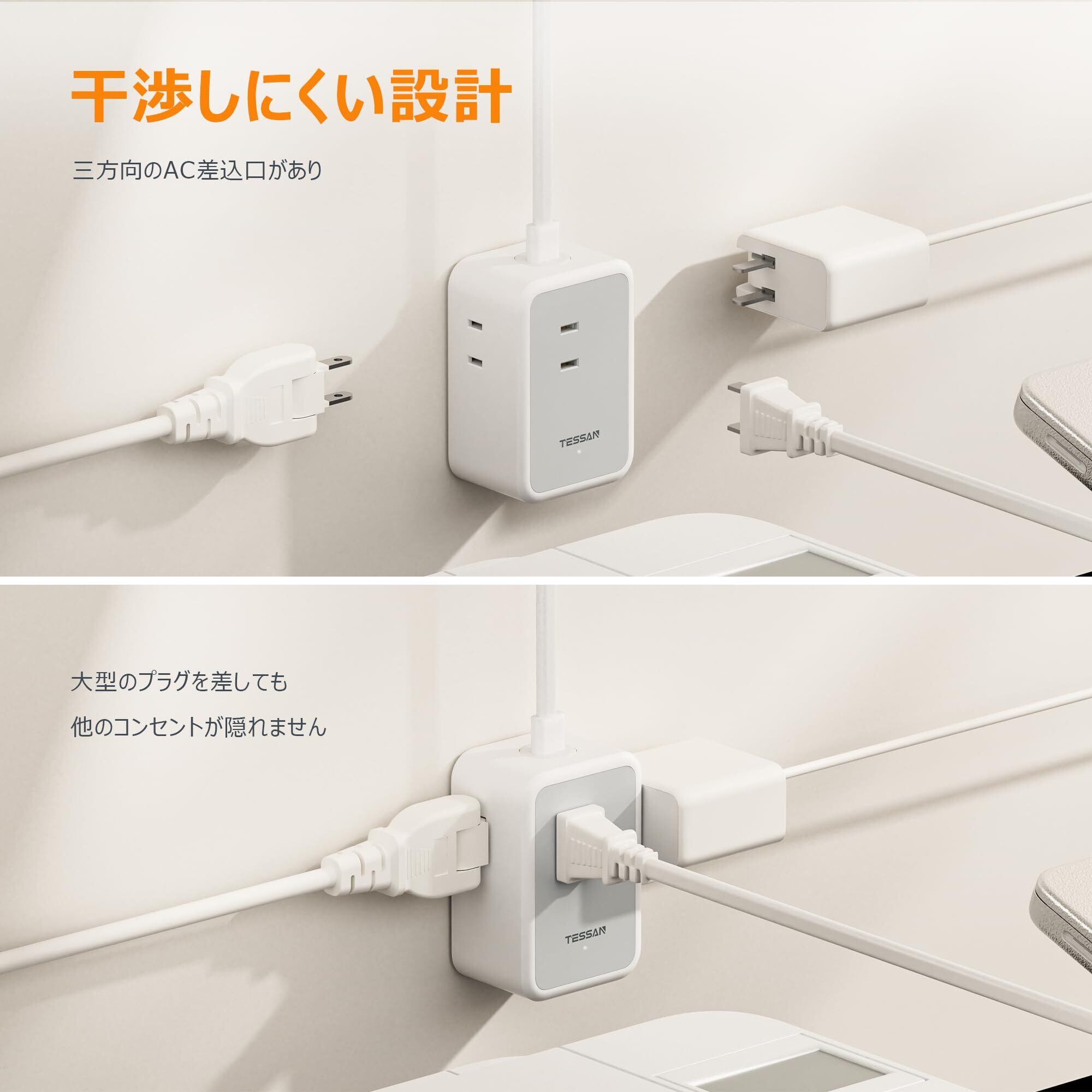 延長コード 短い 20cm 電源タップ usb たこあしコンセント テーブルタップ 0.2m TESSAN 3個AC口 1個type-c 2個タイプAポート 電源コード マルチ タコ足配線 分岐 oa 壁掛 卓上