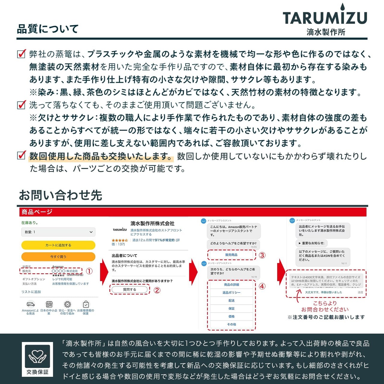 【交換保証】入出荷時の検品で良品であっても皆さまのお手元に届くまでの間に稀に乾湿の影響や衝撃等により割れや剥がれ、その他諸々の予期せぬことの発生する可能性を考慮して新品への交換保証に応じています。もし細部のささくれがヒドイと感じる場合や数回の使用で変形などが発生した場合はどうぞお気軽にお問合せください。