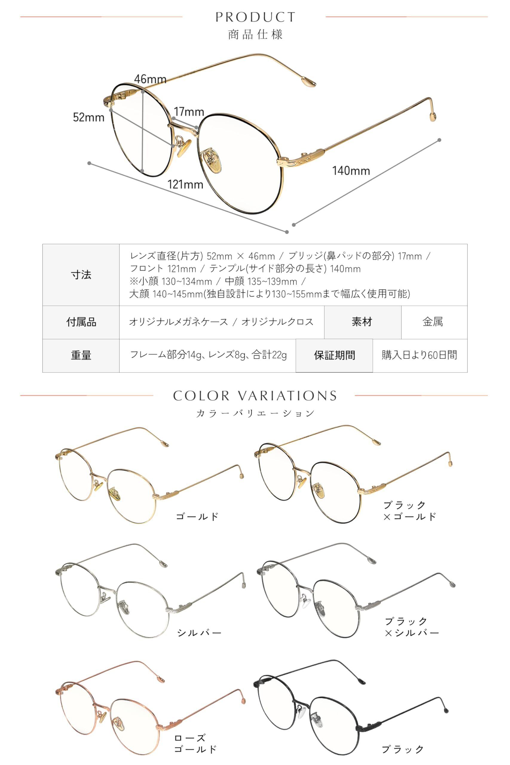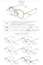 【商品仕様】寸法 :レンズ直径(片方) 52mm × 46mm / ブリッジ(鼻パッドの部分) 17mm / フロント 121mm / テンプル(サイド部分の長さ) 140mm ※着用参考サイズ:小顔 130~134mm / 中顔 135~139mm / 大顔 140~145mm(独自設計により130-155mmまで幅広く使用可能) ・付属品 オリジナルメガネケース オリジナルクロス ・フレーム重量:約14g ・素材:金属 ・保証期間:購入日より60日間
