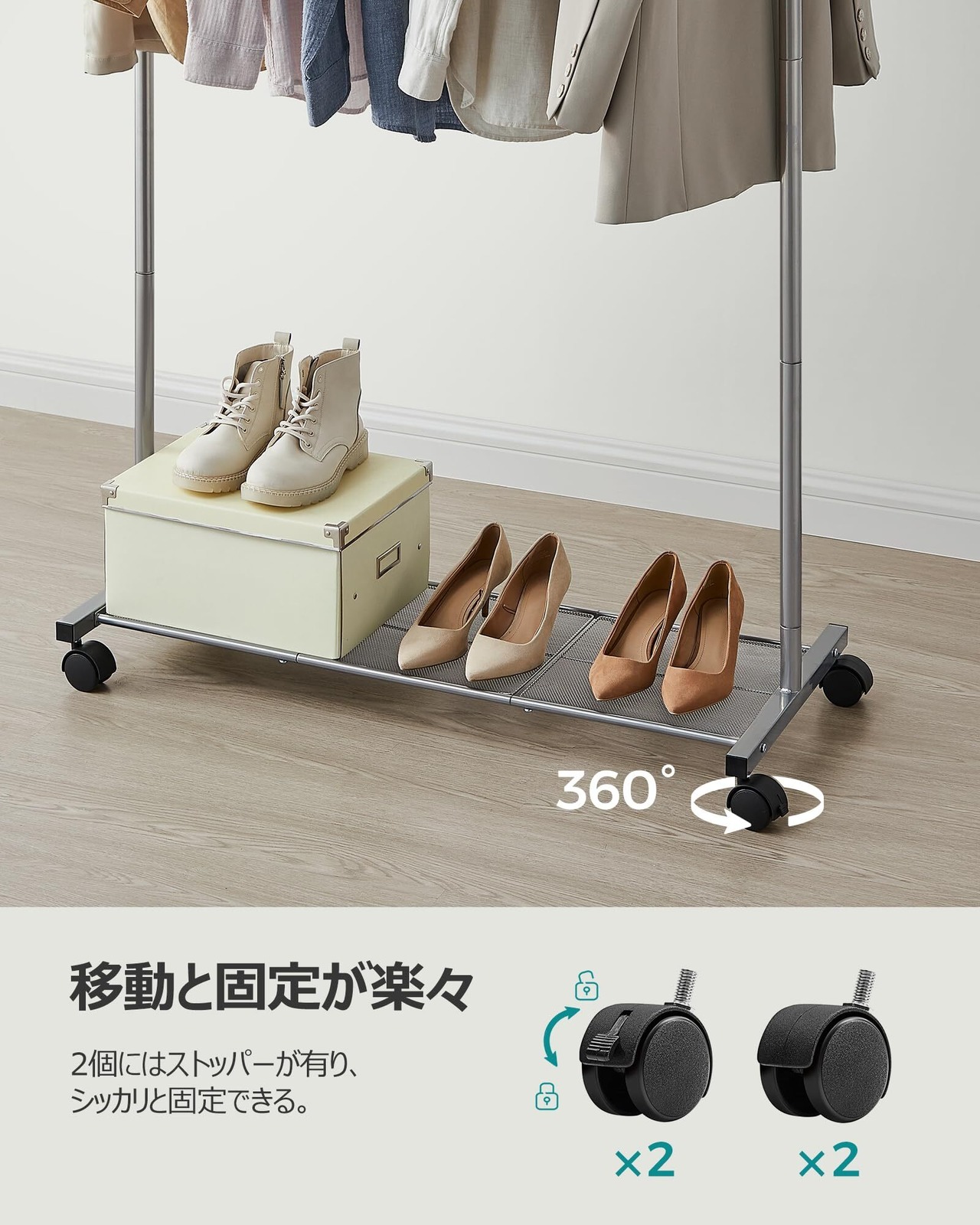 【移動しやすい】四つのキャスターがあり、服などを掛けたままでスムーズに移動でき、お掃除も便利になります。さらに、ストッパー付きで静止時はシッカリと固定できます