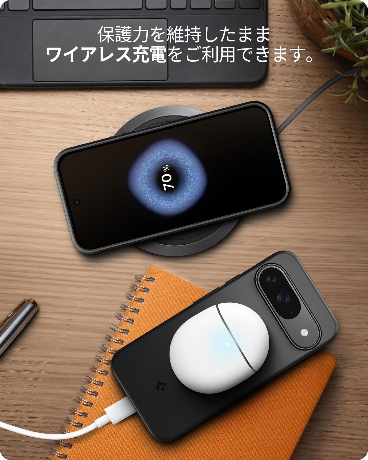 【ワイヤレス充電対応】程よい厚さでケースを装着したまま「ワイヤレス充電」が行えます。