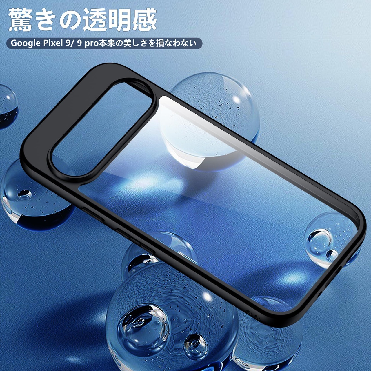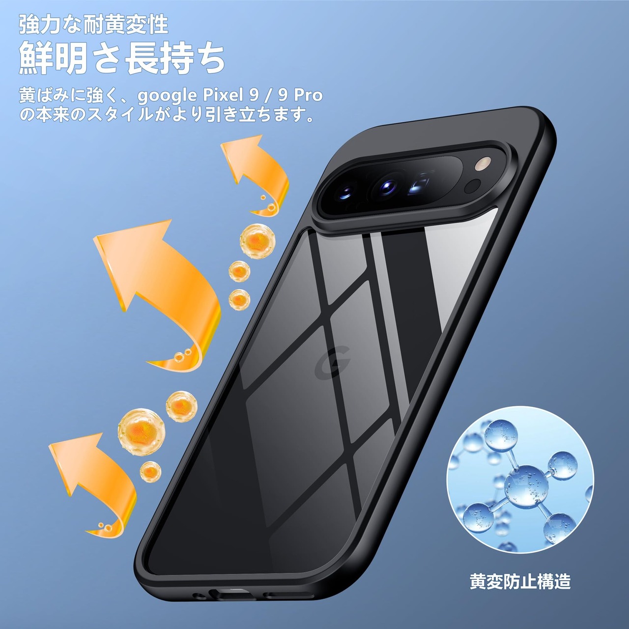 【圧倒的な透明感】透き通った高い透明度を誇り、pixel 9/9 pro本来の美しいデザインとカラーをそのままに楽しめます。耐黄変分子充填技術を採用し、常に透明感を保ち、長時間使用しても黄色に変わりません。グーグル ピクセル 9/9 pro ケースの背面は放熱性良いポリカーボネート素材で、熱を効果的に放散し、バッテリーにとても優しいです。