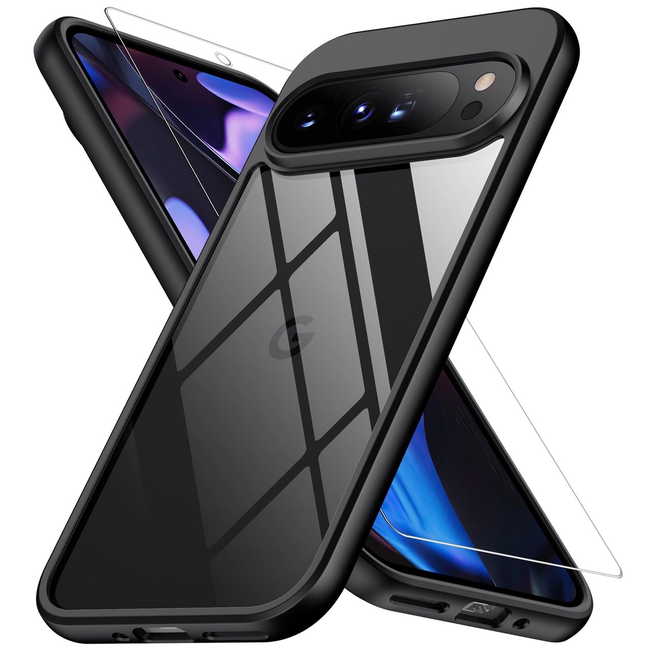 Google Pixel 9 用 ケース Pixel 9 Pro ケース ブラック ガラスフイルム保護付き 黄変防止 グーグルピクセル9/9pro 耐衝撃 指紋防止 落下防止 耐久性 ストラップホール付き 薄型 軽量 ソフトカバー ワイヤレス充電対応 google ピクセル9/9pro