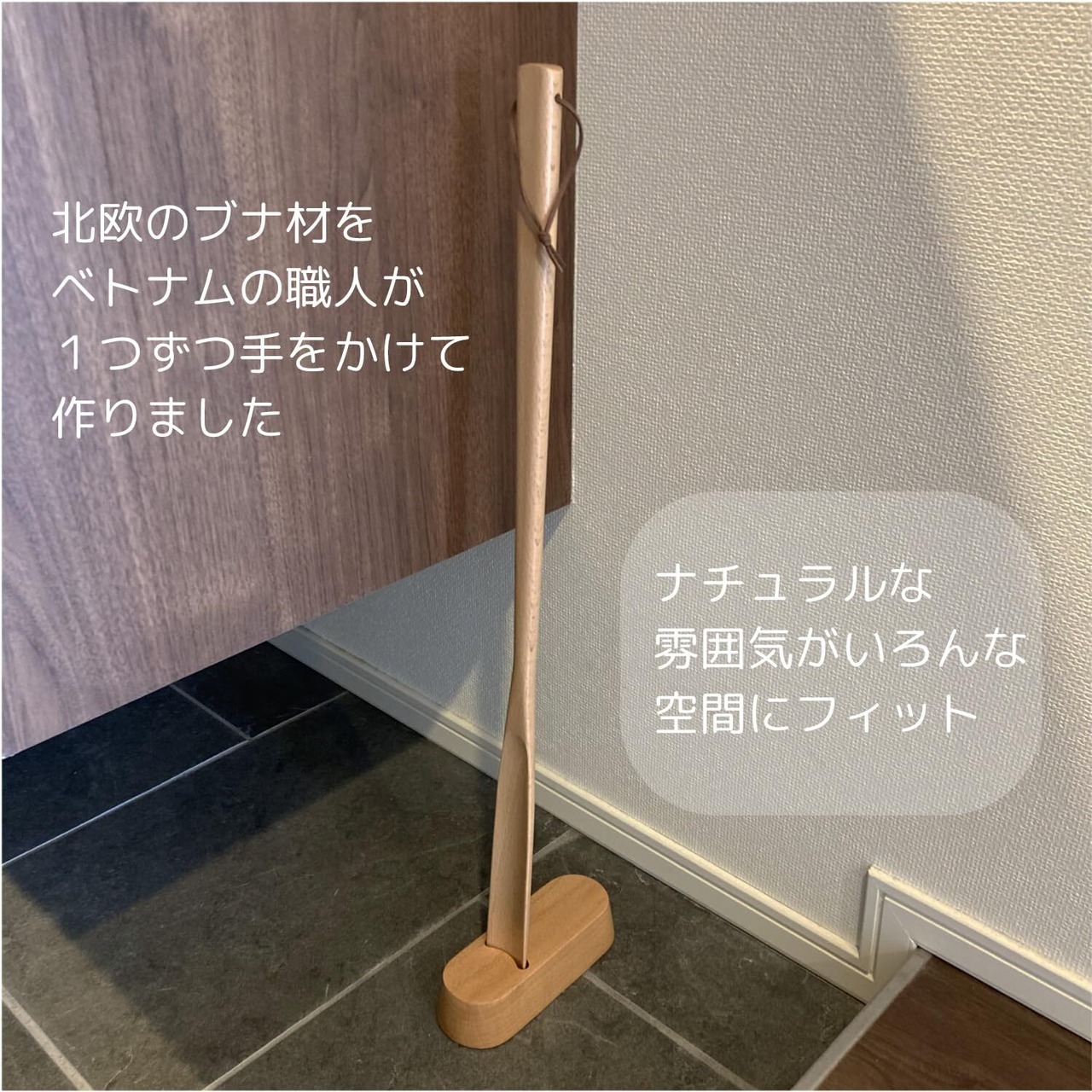 丁寧な加工ですべすべ滑らか、木製スタンド付き靴べら