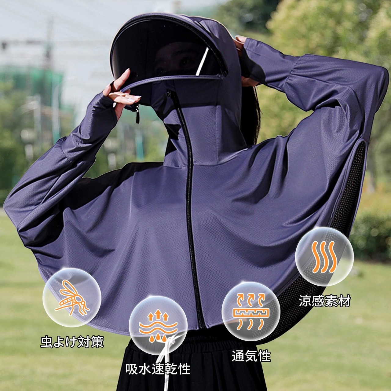 フロントジップを口元まで上げれば、マスクになる、紫外線カット+通気性、吸水性に優れの高機能パーカー。 360度カットすることで、顔や首の周りをしっかりと守ってくれます。束ねた髪を出せるスリット付きて、フードの中で髪の毛がもたつくこともありません。様々なシーンで活躍してくれます。