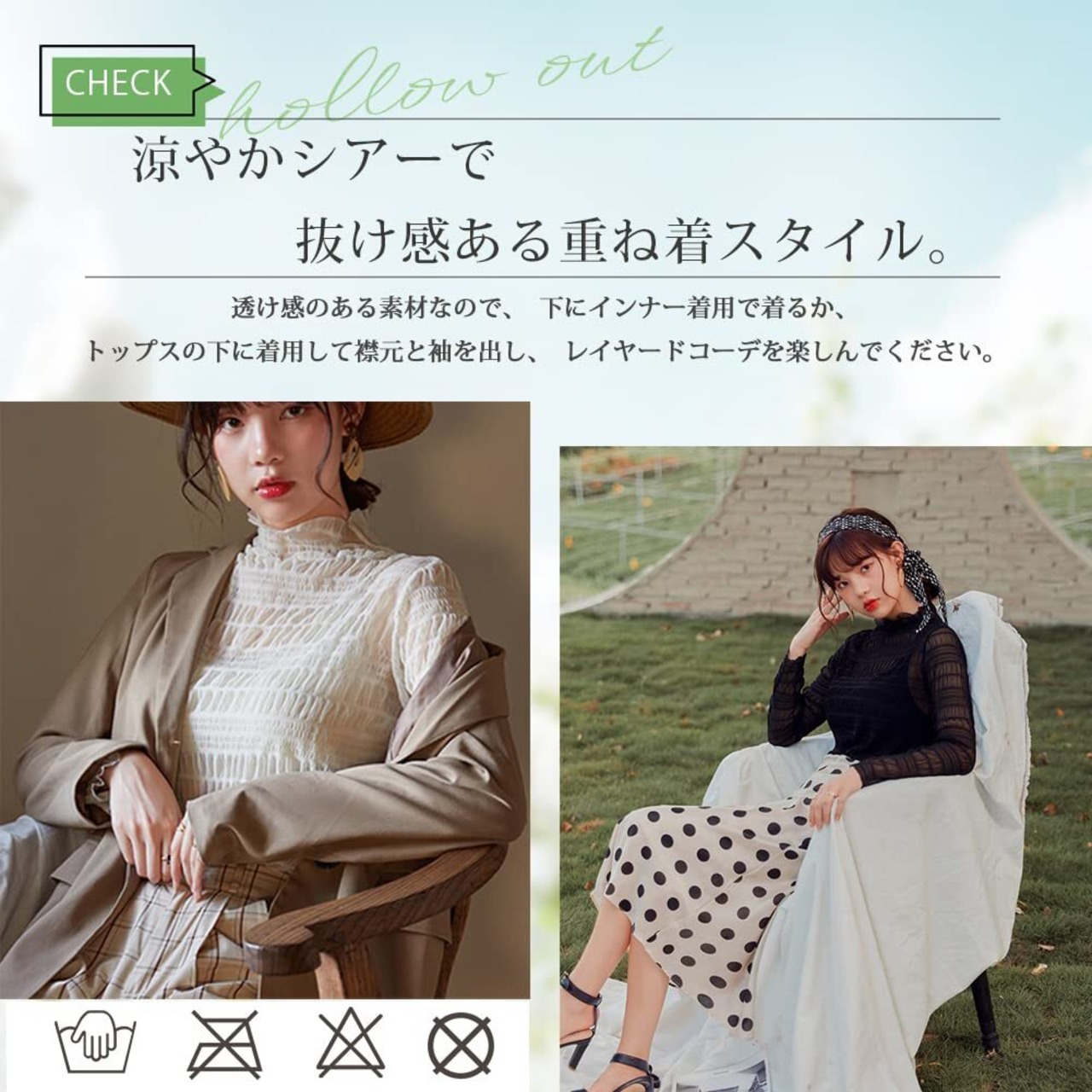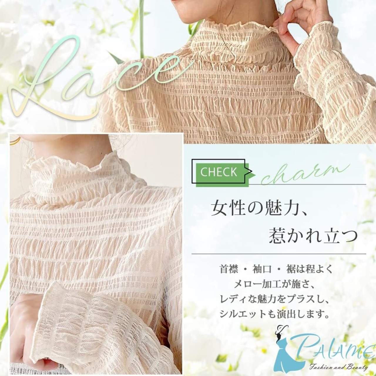 【首の美しさ・小顔】透け感があるチュールによって通気性が良い上、本人はもとより、周囲の人にも清涼感を与えます。ハイネック仕立ては透かし彫りレース下細い首が見えつ隠れつし、クリーンな表情で上品に着こなせます。 カジュアルからキレイめまで幅広く使えるブラウス。首元には、ネックレスで華やぎをプラスするのもおすすめです。