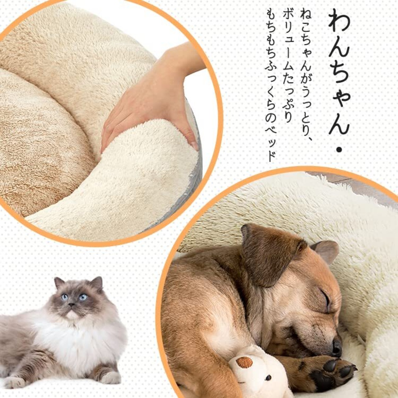 【高品質な素材】素材:スエード+PP綿。弾力性抜群なPP綿をたっぷり充填したこのペットベッドは、分厚いため型崩れしにくいです。ふかふかして暖かいので、どんな季節でも気持ちよくスヤスヤ寝られます。表面に施された綿毛素材はとても柔らかく、肌触りも最高