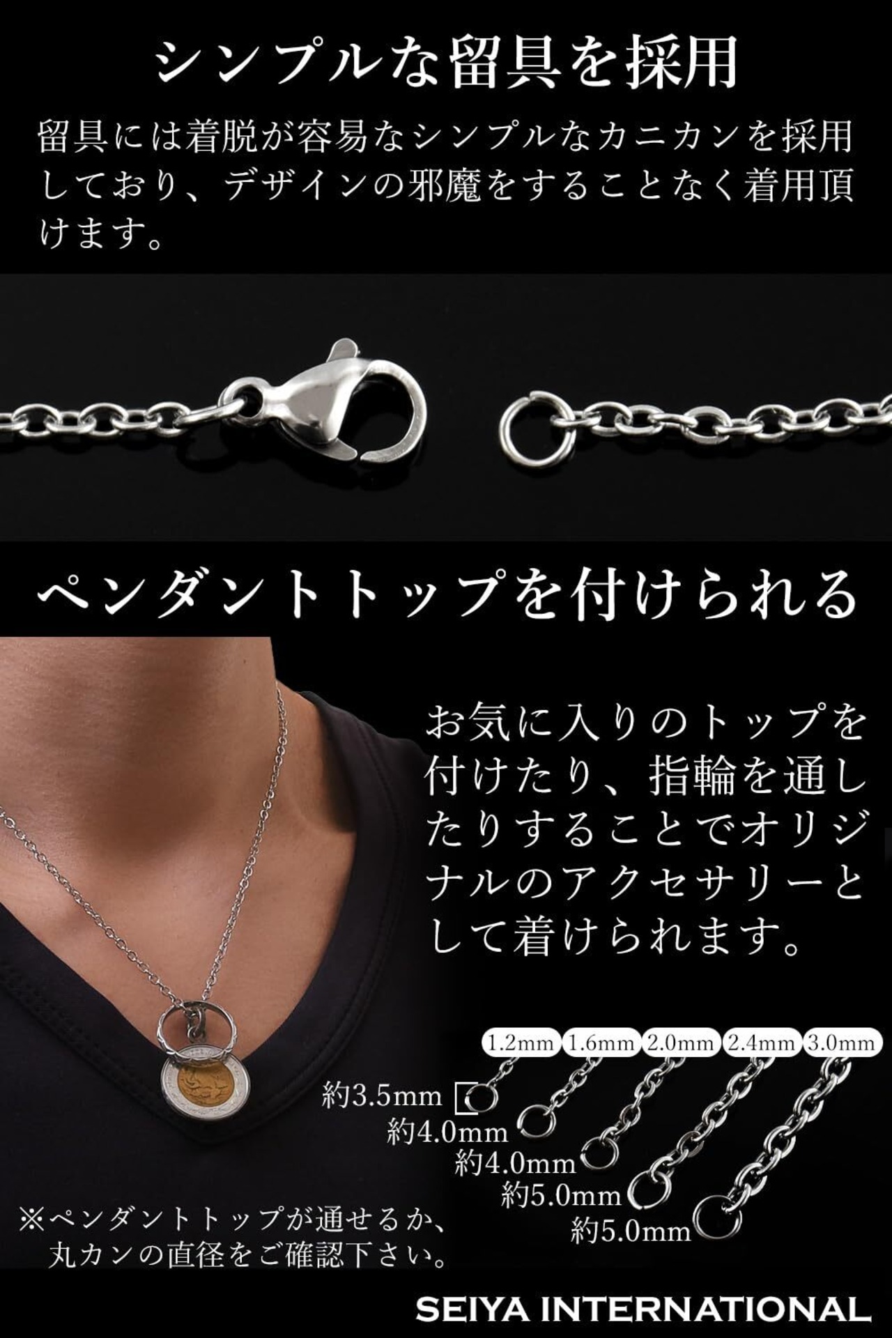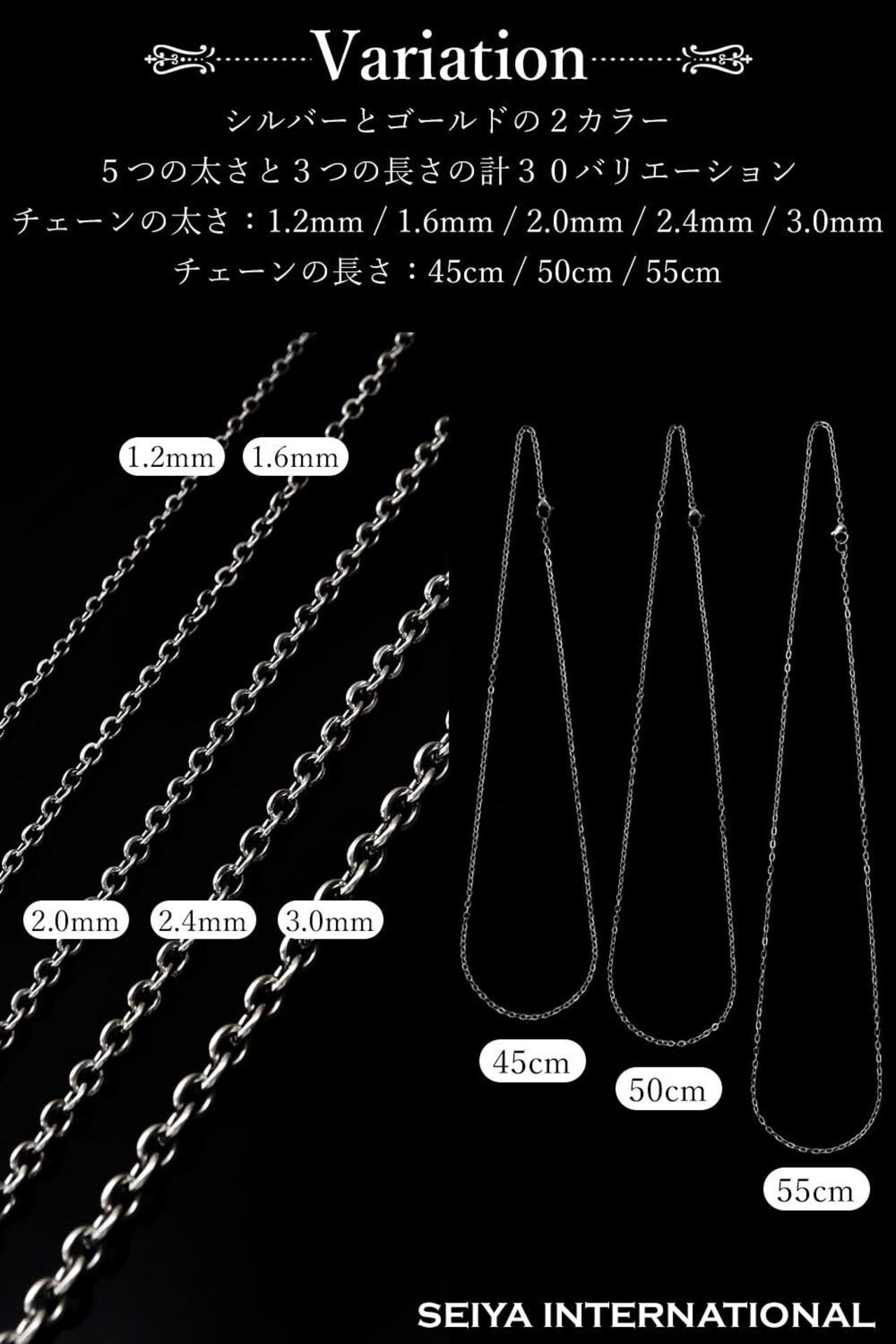 【 豊富なバリエーション 】ネックレスチェーンの太さ1.2mm・1.6mm・2.0mm・2.4mm・3.0mm、チェーンの長さ45cm・50cm・55cmのそれぞれ計30種類ご用意しております。シンプルな細めのチェーンタイプから存在感がある太めのチェーンと長さを自由に選べるため、きっとあなたのお気に入りの商品が見つかるはずです。2つ、3つと重ねて着けたり、ペンダントトップやリングを着けたりなどお好みのスタイルで楽しめるチェーンネックレスです。このチェーンネックレスで周りと差をつけられること間違いなしです。