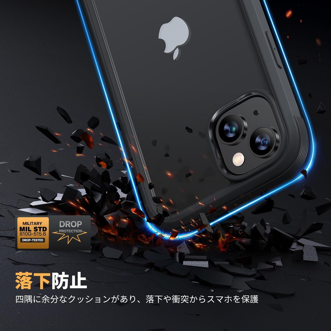 「360°フルボディで頑丈な保護」TPUとPCの2重構造で耐衝撃性に優れ、嵌め込み式バンパーと透明バックカバーの組み合わせにより、スマホ本体の美しさを邪魔しなく、頑丈な保護を提供します。スマホ本体をを囲む4つのコーナーが不意の落下からiphone15を保護します。