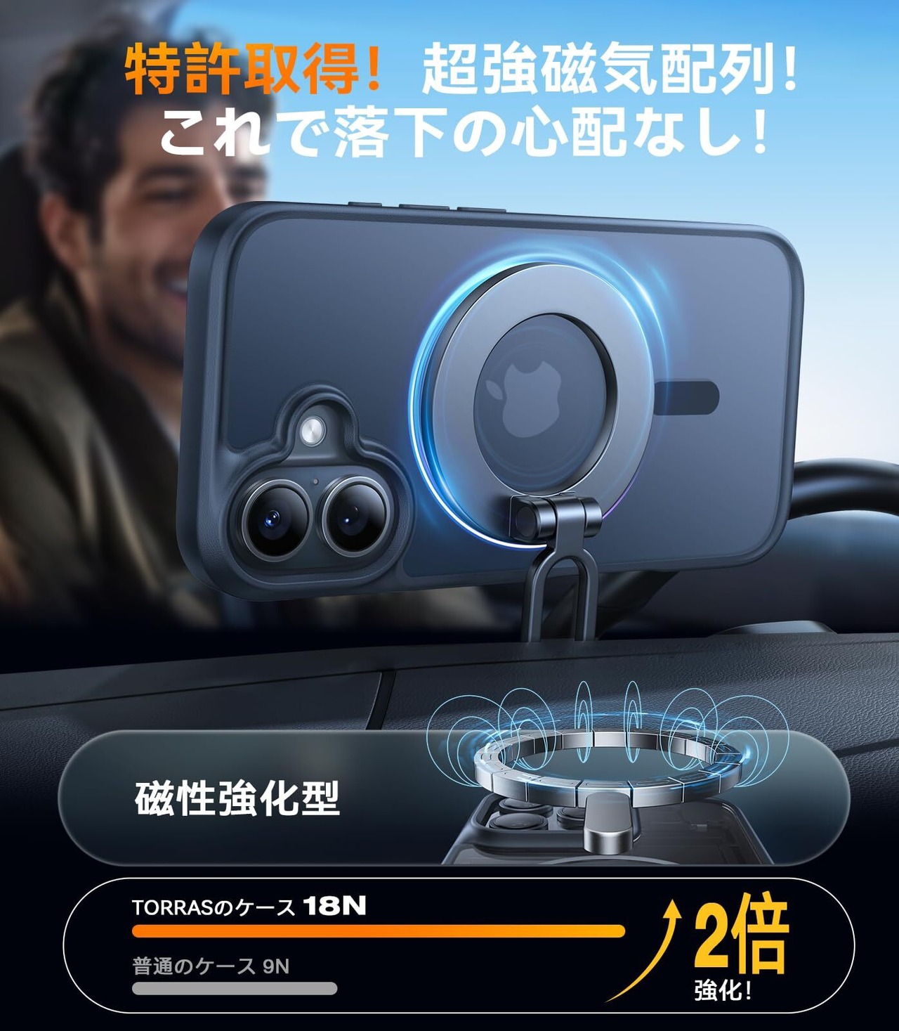 【本当か!特許を取得したマグネット!これこそ驚異的な安定性だ!】TORRASのGuardian Magは、世界累計1100万台販売実績、多くのユーザーの好みの選択肢になっている。最新のGuardian - MagはiPhone 16 に対して、より優れた保護と磁力を提供できる。特許技術に基づくN52マグネットは最適な配列で設計されて、他のケースの磁石より40%も強い。ワイヤレス充電から車載ホルダーまで、幅広いMagSafeアクやセサリーと簡単に互換性がある。また、磁気リングは素材とサイズが携帯に組み込まれた構造に正確に合致して、公式の基準を満たしている。軽く吸着して、瞬時に強力で精密にフィットする。迷わずこのiPhone 16 用のケースを使える。どんな揺れにも強く、しっかり固定されているから、簡単に外れない。iphone 16 ケース