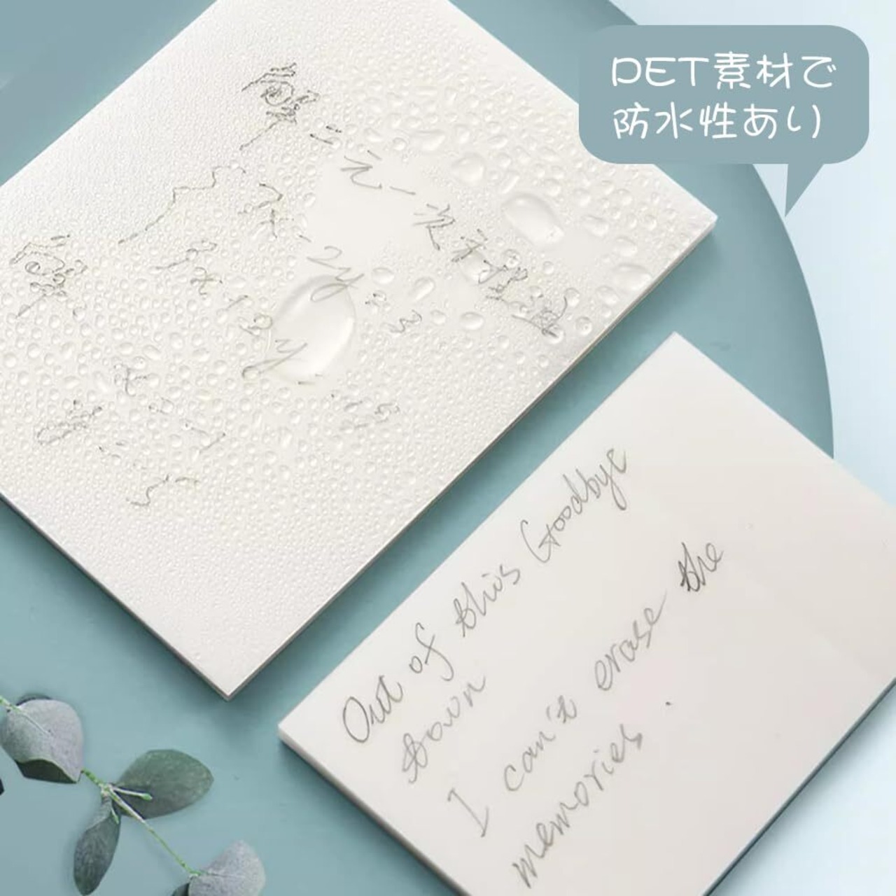 【素材】PET製。防水性があり、耐久性に優れていて破れにくいため、繰り返し使用することが可能です。インクの吸収性が紙質より弱いので、ボールペン、鉛筆、油性マーカーで書くことをおすすめします。
