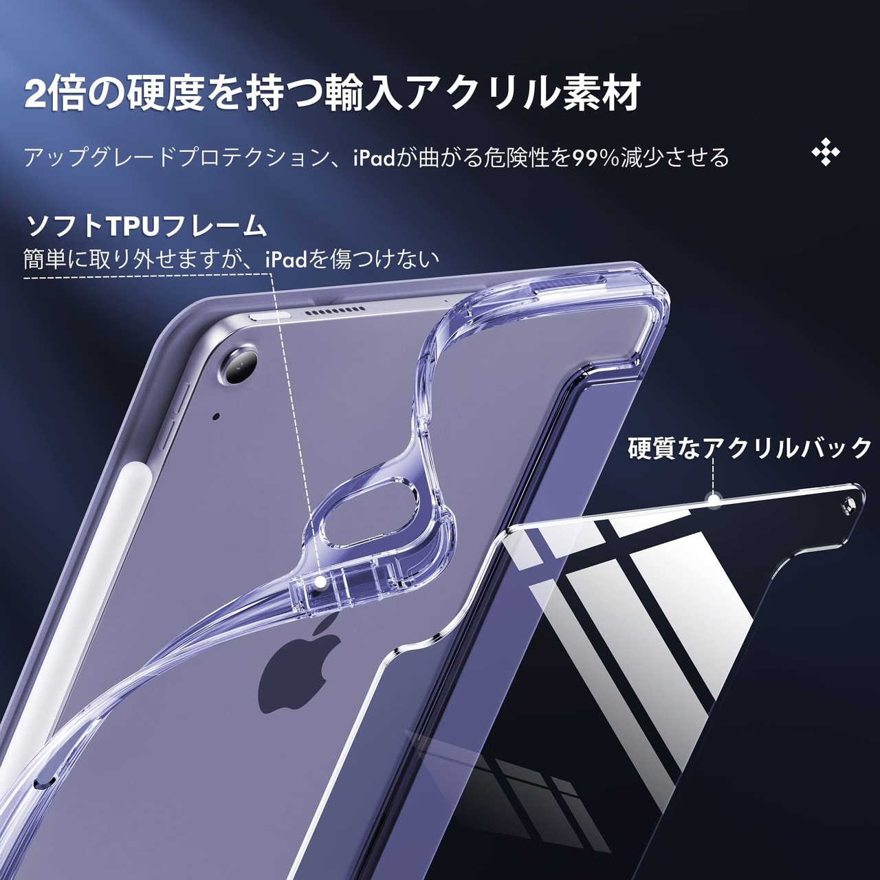 【材質&外観】表は上質なPUレザーを採用しており、手触りも良くで、本体もきれいに保護します。裏はTPU材質を採用してため、取り付け/取り外しが簡単です。 全透明なカバーはiPad のロゴが外見を引き立たせ、タブレット本来の美しさ表現、傷や埃からiPadを守ります。