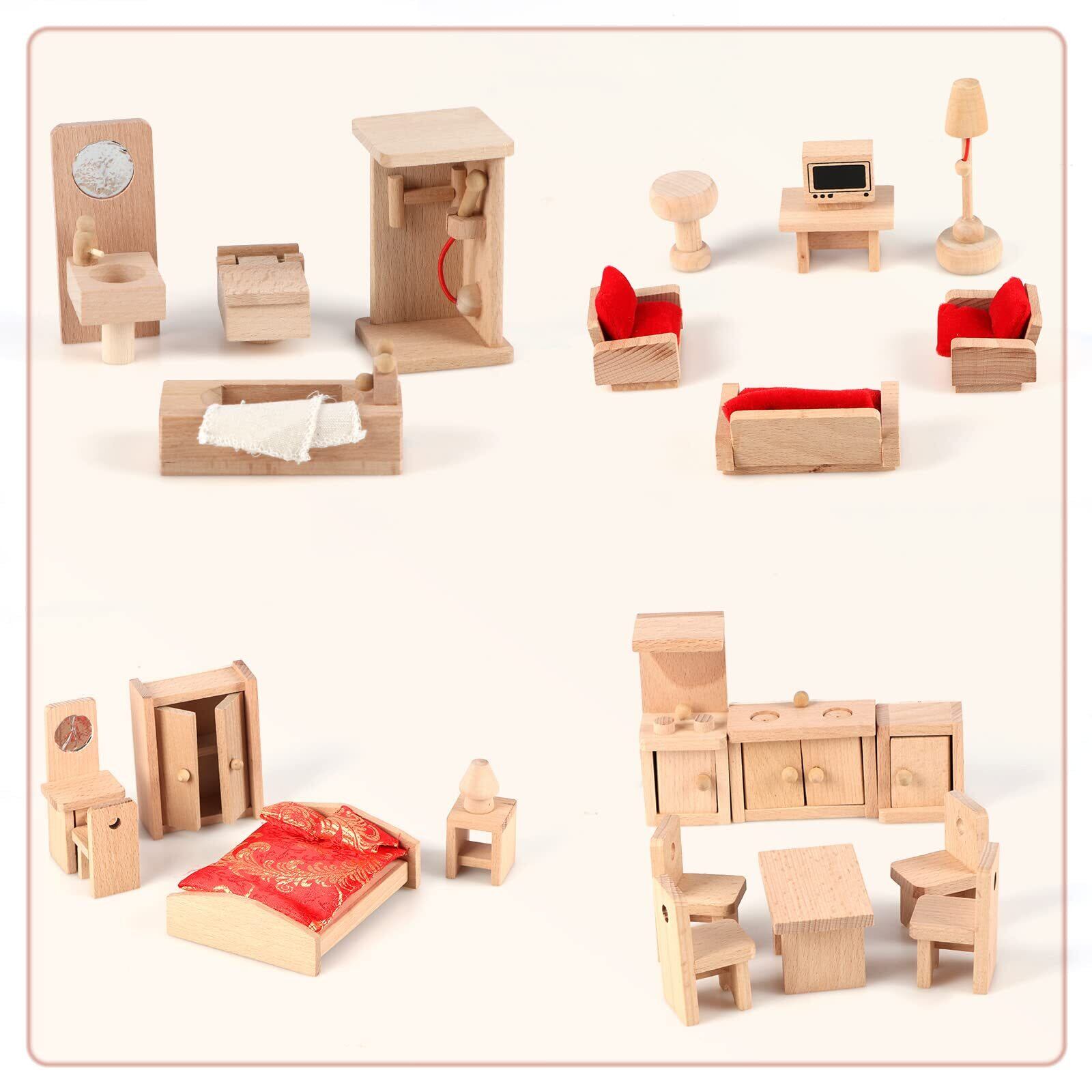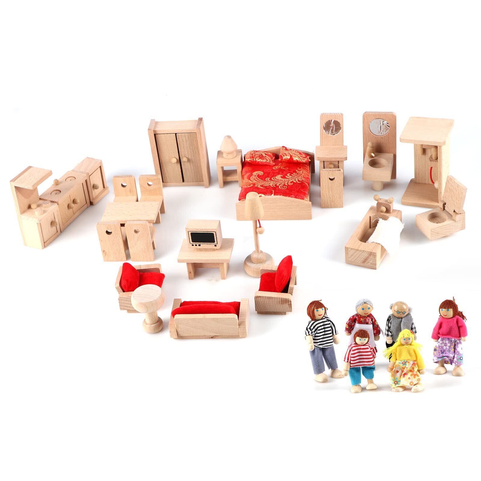 ドールハウス家具セット:バスルーム、リビング、ダイニング、寝室、キッチンと6人の家族人形を含む木製家具5セット。おもちゃ屋のゲーム用の木製家具は5セットあり、浴室、リビング、レストラン、寝室、キッチン、おもちゃ人形6個が含まれている。