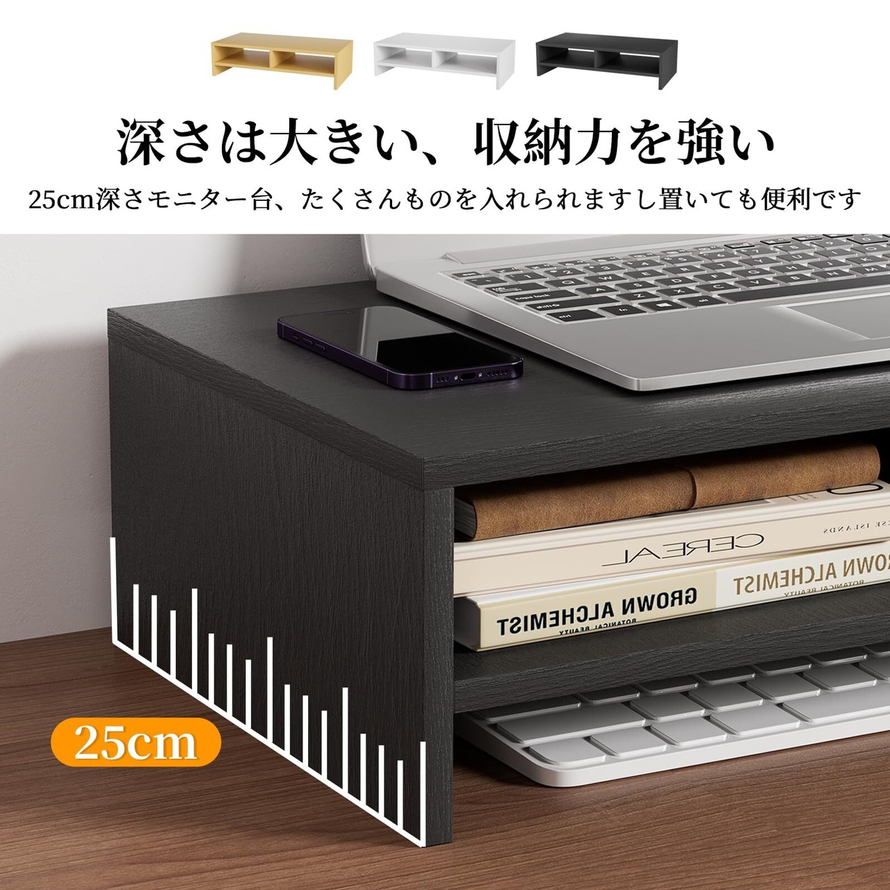 【商品仕様】机上ラックの本体サイズ:幅50*奥行25cm*高さ14cm本体重量:約2.5kg。 耐荷重 : 40KG 本モニター台はMDF/合成繊維板で作られます。この素材はコストパフォーマンスが優れて、環境にやさしいです。