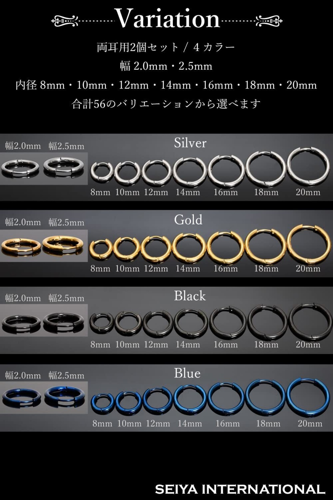 【 選べるカラー・サイズ 】カラーは人気のシルバー・ゴールド・ブラック・ブルーの4カラーをご用意しました。フープピアスの幅は細めの2.0mmと一般的な2.5mmの2タイプ、サイズは内径8mm・10mm・12mm・14mm・16mm・18mm・20mmからお選びいただけます。ピアスゲージは一般的な18G(約1.0mm)になります。フープピアスのサイズはわっかの直径が大きいほど存在感があり、カジュアルな印象を与えます。シンプルなコーディネートに華やかな雰囲気を加えたい時は、直径の大きなフープピアスがおすすめです。一方、わっかの直径が小さいほど上品で落ち着いた印象になります。シックにまとめたい時やビジネススタイルに合わせる時には直径が小さなフープピアスがおすすめです。