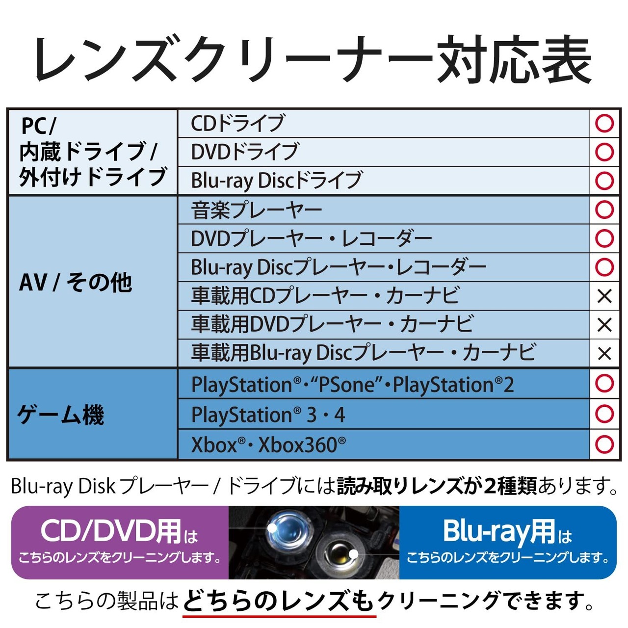 Blu-ray Discプレーヤー/ドライブには読み取りレンズが2種類あります。本製品は2種類のレンズをどちらもクリーニングすることができます。CD/DVDプレーヤー/ドライブにも対応しマルチにお使いいただけます。