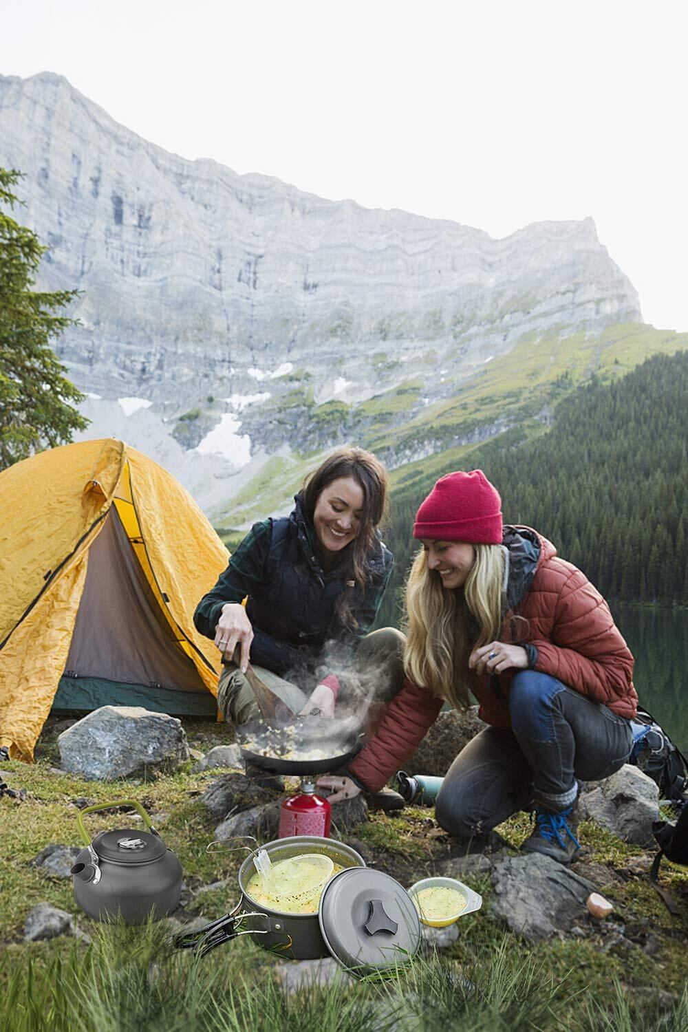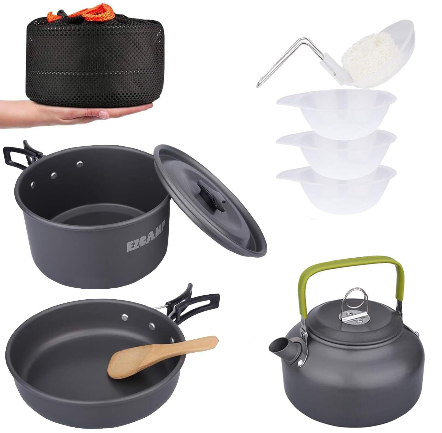 【多様な用途】:アウトドア用にも家庭用にも適しており、キャンプ、登山、フィッシング、BBQ、大人気です。【製品詳細】重量:850g;鍋、フライパン、ポット、食品レベルPPお碗×3、ひしゃく、スポンジ、スプーン、収納袋